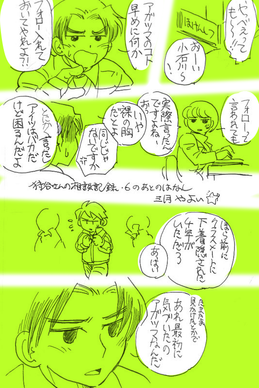 sanga2paper☆quiet followDOODLEなんとなく描いていた、狩谷さんの相談記録6の後の森村三小。アガツマ先生が学校内であんまり適切でないことを言ったせいで不信感を持たれてた頃(追記・大変申し訳ございません、色枠つけるの忘れたので画像を差し替えました_(:3」z)_リアクションくださった方々ありがとうございます…!) show all(+2 images) Tap to full screen (size:534x800).Repost is prohibited Let's send reactions! freqpopularsnackothersPayment processing Replies from the creator Follow creator you care about!☆quiet follow sanga2paperDOODLE呉竹水彩紙にエフ水彩(ペールオレンジ、ぞうげいろ、はいいろ)。水色だけ100均の固形絵の具#透明水彩#半透明水彩#ふれずの勇者 2 sanga2paperDOODLEコピックイラコンに出した二作+間に合わなかった一枚+オマケらくがき#コピック#一次創作 5 sanga2paperDOODLE桃の節句・耳の日・ウサギの日それぞれの絵。順に、キャンドゥのアルコールマーカー、ホルベイン透明水彩、呉竹筆ごこち(普通の・うす墨・極細)で#一次創作 6 sanga2paperDOODLEクーピーマーカー(夕焼けカラー、朝焼けカラー)の試行錯誤絵まとめ。途中にジャンボカラーや色鉛筆との比較絵もあります#クーピー#アナログ#一次創作 5 sanga2paperDOODLE毎年恒例2023〜2024年跨ぎ絵、経過もまとめておきます#オリジナル#一次創作 10 sanga2paperDOODLE1枚目…25年前に描いた漫画の表紙を、今の絵で描いたもの2枚目…25年前に描いた漫画の表紙を、今の彼らで描いたもの3枚目…25年前に描いた漫画の表紙(写真)#一会町トリオ3枚目以外はカクノ細・極細で#万年筆#オリジナル#アナログ 3 recommended works ちゅう太郎PAST水彩始めたばっかりの時の出てきた#ナンバカ#銀魂#透明水彩#ウノ#沖田総悟 2 ametukiDOODLE2018年11月10日#創作 #アナログ #水彩 #透明水彩画材お試し会にて sanga2paperDONEなんか想像とだいぶ違うところに着地させてしまった感があるけど、ひとまずこれで完成 #かく幽 あやほしよぞら(恠星夜空)PASTハンス・クリスチャン・アンデルセンでは本日最後の初日投稿。これは去年の春休みだったかなぁ、未だに版権垢のアイコンにしてるくらいお気に入り。髪の毛ええかんじやん?(自画自賛) あやほしよぞら(恠星夜空)DONEあんスタイラストデビュー青葉つむぎくん! あやほしよぞら(恠星夜空)DONEお友達に頼まれて?てかお題箱だけど、ルルーシュくん!目ちゃんとギアスマーク入ってるんだよ…みえるかな…いつもと違う塗りしようと思ったら迷走したけど結構いいんじゃないかなぁ 行けたら行くわDONE水彩久しぶりすぎてワイセンドゥングドゥングでした。光が思ったより汚いです。 ほしこめPASTいちごの赤ちゃん師弟 vanvan_62PROGRESS人魚ミクさん青色を塗るのは楽しい…!塗り塗り✩٩(`・ω・´)و