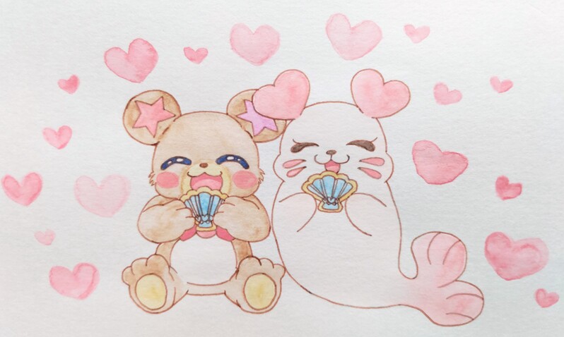 プリキュア色紙ARTの絵でモフルンとくるるんが仲良しでかわいかったので描きました🧸🦭 一緒に貝がらクッキーを食べてるところです🥰