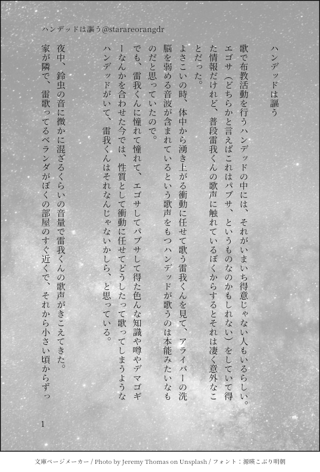 starareorangedr☆quiet followDONEハンデッド小説。穏人くんと雷我くんのはなし。何でも許せる人向け。なにもかも捏造だし辻褄もあってないけど書きたいからかいた。 #小説 novel show all(+2 images) Tap to full screen (size:630x928).Repost is prohibited Let's send reactions! freqpopularsnackothersPayment processing Replies from the creator Follow creator you care about!☆quiet follow starareorangedrDOODLE見れば見るほど逆バニーだな…ってなって気がついたら描いてた…ハサウェイのパイロットスーツの逆バニーのやつです starareorangedrDOODLE夜中に急に連邦軍の制服ってかなりバニーでは?って気がついてしまったのでブライトさんに着てもらった白タイツの差分追加 3 starareorangedrDOODLEオメガバース時空のミラブラのブライトさん※人を選ぶ題材だと思うのでワンクッション何でも許せる人向け starareorangedrDOODLE催眠在宅ウォッチでブライトさん受けで色々やってたんだけどワケブラだけ何故かブライトさんがノリノリでなんか可愛かったので描いたメイド服着衣エロだけど全然何も出てない雰囲気エロなだけですなんでも許せる人向け 2 starareorangedrDONEDKカルテ77K品が未然なら軽佻な冗談、成立してたらこういうことしたのはお前だけというあれの漫画なんだけど、Xにじかに載せるのはなんとなく憚られる気がしたのでポイピクに置いておきます。本当に何でも許せる人向けです。色々な所に配慮が足りない気がしているので、もし読んでいやな気持ちになる方がいらしたら申し訳ないです starareorangedrINFO命のK譜 新刊サンプルです。漫画/コピー/A5/16頁/100円/全年齢西城KAZUYA×高品龍一(K品)龍一の苦悩後web再録1ページあり Kの死を認められなかったのは本当はKAZUYAのせいもあるんじゃないの~~? という掌編。そういう思想で作っているので苦手な方はご注意ください 5 related works starareorangedrDONE恭龍の小説(まだつきあってない) 3 文月ちえり&中の人MAIKING作業進捗?みたいな感じの投稿だけど、現在Newお仕事に夢中で絶賛放置中な執筆中小説の一つ。第1章の序盤で、サイトにて公開中な10,000文字の約半分相当です。#青春 #小説 #中学生 #オリジナル#自家製本 して書籍化予定です!#文学フリマ #前橋 #東京 #文フリ 出店予定 14 siro1516INFO先程お伝えした「小さな炭治郎くんと義勇さん」からのご挨拶と「お知らせ」を別で投稿です。 4 ももみつDONEマターさんとクラフターさんの、日常の一コマ話。小説。 9 siro1516TRAINING『小さな子供との夏祭り編』2/2枚 10 zeppei27DONEなんとなく続いている主福のお話で、単品でも読めます。七夕を楽しむ二人と、夏の風物詩たちを詰め込んだお話です。神頼みができない人にも人事を超えた願いがあるのは良いですね。>前作:昔の話https://poipiku.com/271957/11735878.htmlまとめhttps://formicam.ciao.jp/novel/ror.html 3654 かほる(輝海)PROGRESSエアコミアンソロ進捗。やっと攻守交代まで来た(*´艸`*)そして、一番言わせたかったセリフまできた…あぁ満足…まだ終わらないよ(*´ω`*)肝心のセリフに字が重なってる…(´・ω・`)タップすると全部見えるようになります。 かほる(輝海)INFO平成最後にネップリ折本出します。A6サイズ8ページ。R18小説を二本収録。そのうち一つは、ここで公開済みの「路地でもっこりする二人の話」です。コードは29日の夜遅く(30日に日付が変わる頃)に支部で公開します。サンプルで1ページだけチラ見せ。よろしくお願いいたします。 kabolove22DONESSメーカーで作った小説です。 8 recommended works けだまDOODLEタイツの日に描いた🍷と💢です 2 かずさ(千戸)DONE♣️❤️♀ちゃんバレンタインデート 2 あざきDONE【女体化】【現パロ】水着月鯉♀音之進お嬢様のバカンスに付き合う月島 nishikusa7DOODLEみこがじゅが欲しいと聞いたんですけどおっぱいかきたくてないくちゃんになった 性癖ハッピーセットDOODLE前世記憶アリの尾(♀)と前世記憶ナシ杉(♂)のハッピー転生ライフ(尾杉)1枚目だけただの尾杉 4 LIKEZSPAST2012年ゾロサン女体化合同誌《Mr.Princess》に収録されているショート漫画web再録〈狐打牆〉※中国語です 20 sgn_iroDOODLE女体化ぽちゃん太腿に輪っかをつけたかった。二枚目だんさんに腕輪ラさんじゃんっと見つかったのでせっかくなのでおそろ服にも。 2 うさちーDONE再投稿。誰でも閲覧出来るようにしました。春千夜の誕生日のときに描いたイラストです。ムがいないけど…ム三です。 ちゃ🍙🍙🍙DOODLEスモロ♀ 少しえっち?