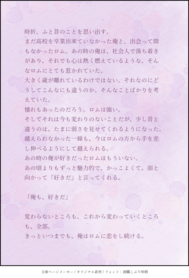 nnmy_02☆quiet followDONE友人からのお題「オレの好きだったロムはもういない」バッドエンドは友人たちが書くかなと思って無理やりハッピーに仕上げました。幸せになれ。 ##ろむじょ Tap to full screen (size:630x928).Repost is prohibited Let's send reactions! freqpopularsnackothersPayment processing Replies from the creator Follow creator you care about!☆quiet follow nnmy_02DONEとある悪魔と信者の話。レのつく悪魔を知っている方 かつ 何でも許せる方のみどうぞ。合言葉はYESだよ。友人に設定借りて書きたい雰囲気だけ書きました。サンキュー友人。 3 nnmy_02DONEろむじょと白の話。甘いです。 443 nnmy_02MOURNING桜が散る頃の話。を書いてたけど書きたいところ書いたら続きがうまく浮かばなくなったので供養。 498 nnmy_02DONEろむじょで書き初めしました。砂糖と読点ましましです。 650 nnmy_02MOURNINGえーじさんのクリスマスその後。の前後の話を捏造しました。えーじさん許可済み。雰囲気で読んでください。 1660 nnmy_02MOURNING🔥🍱です。表記ミスじゃないです。🔥🍱です。ただセッしてるだけなんですが一文が浮かんでしまった以上書かなければ消えない難儀な字書きもどきなので供養です。しつこいようですが🔥🍱です。 420 recommended works nnmy_02DONEやすじょ。酔っ払いじょうさんふわふわにしがち。ワードパレット頑張って全部書けたらいいなぁとは思っているので浮かんだら増えます。IDを入れることをやっと覚えました。 3 nnmy_02DONEやすじょ。死神八咫烏の話のすぐ後のこと。 2 nnmy_02MEMOろむじょ。“保健医の衣装決まって「ネクタイの結び方教えてくれ」って言ったら後ろから抱き込まれる形で教えてきて集中できないやつ”そんなネタを友人が話してたので勝手に書いた。許可は取ってる。 2 nnmy_02DONEついったに投げてた1日1ジョウさんのまとめ、そうじょ編。 12 nnmy_02DONE1日1ジョウさんまとめ、やすじょ編。 10 nnmy_02DONE1日1ジョウさんまとめ、ろむじょ編 4 nnmy_02DONEそうじょ。ワードパレットお借りしました。途中でこれ書く必要あるのかなとか考えてました。書けて良かったね。 3 nnmy_02MOURNING気が向いて続きが浮かべばと片隅に置いといたネタを書きたかったとこ書いたあと一向に気が向かなかったので供養。そうじょになるはずだったんだ。 820 nnmy_02DONEろむじょで書き初めしました。砂糖と読点ましましです。 650