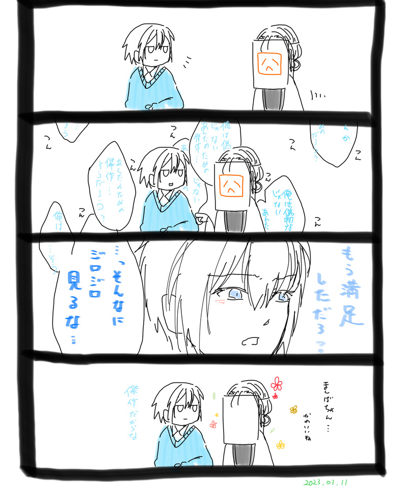 風原緋仔☆quiet followDOODLEふふ…かわいいね… #刀剣乱舞 Touken Ranbu Tap to full screen (size:1536x1862).Repost is prohibited Let's send reactions! freqpopularsnackothersPayment processing Replies from the creator Follow creator you care about!☆quiet follow 風原緋仔MAIKING百鬼夜行のときの近侍との会話をメモしようと描き始めたけど、心が落ち込みすぎて続かんかった/(^o^)\ 2 風原緋仔MEMO 風原緋仔DOODLE歌仙「もし主が兼元をそのような呼び方にした日には……😞」山姥切「まあ…大丈夫なんじゃないか?」後日、本刃顕現後、話し合い()の結果「孫くん(そんくん)」に落ち着くのであった… 2 風原緋仔DOODLE新刀剣男士の情報があがってきたので、京極くんが新刃のいまのうちに描かないとな!!と…日向くんと同じ正宗で、にっかりと関わりのある(だったよね?)京極家の刀だという情報は頭に入っているのに、いざ本刃の前で名前を呼ぼうとすると京極の京も正宗の正も出てこなくて、結局カンスト以降の半月〜一ヶ月の間も新刃くん呼びしてた……京極くんか京極ちゃんか迷ってたけど、ちゃん呼びする子じゃないね、この子。 4 風原緋仔DOODLE目かなぁ…目かもしれんなぁ…布んばのキリッとしたかお、むずかしいなぁ… 風原緋仔PROGRESSページごとに枠線もフキダシも、線幅変わっちゃうの統一しろ…はい… related works knomiDOODLE暖冬暖冬言っても寒い。5周年安定が可愛すぎて悶えました。 屍DOODLEくろだっ Xx_2aoi1_7PAST加州をクールに描きたかった かつおDOODLE #刀剣乱舞#三日月宗近 けいすけMOURNING洗濯している山兄弟。多分完成しませぬ…_(:З」∠)_ キツキトウDOODLE寒いからぬえもふりたい。 なし🍐CAN’T MAKE鶴さん書いたやつの全体〜 マヨコPROGRESS初めて極安定を描いている ななくさDOODLE色塗ろうと思いつつ、白いままだと悲伝感あってわりと満足した。 recommended works 13amsirp31PAST #刀剣乱舞 #厚塗り #らくがき #二次創作 最後のは飽きたやつ…。 20 かつおDOODLE #刀剣乱舞#鶴丸国永#らくがき手入れ 7miya99_0DOODLE #刀剣乱舞 #現パロ #燭台切光忠 #薬研藤四郎 #薬燭現パロ薬研君で背が高くなったから壁ドンすると顔が近いよ(ツイにアップしたのをちょっとだけ加筆 KARI@意外と更新してるDONE #刀剣乱舞 #山姥切長義 #2次創作お迎え記念に描いてみた! wawawaPAST刺青よく忘れる マナタマユムPROGRESS #刀剣乱舞 マナタマユムPROGRESS #刀剣乱舞 逢見ohmiPROGRESSあまり進んでない進捗どうですか 🌲🌲木野🌲🌲TRAININGいったん離れて見るためあっぷ