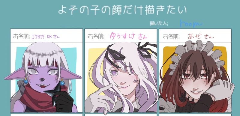 room☆quiet followDONE最近のタグで描かせて頂いたものです。楽しく描かせていただきました。またいつかしたいです。 #よその子 childFromAnotherPlace #よその子の顔だけ描きたい #ケモっ子 #メイド maid #白髪 whiteHair #ツインテール pigtails #赤髪 redHair Tap to full screen (size:2472x1196).Repost is prohibited Let's send reactions! freqpopularsnackothersPayment processing Replies from the creator Follow creator you care about!☆quiet follow roomDONEオリキャラちゃんです。 roomDONE最近のタグで描かせて頂いたものです。楽しく描かせていただきました。またいつかしたいです。 roomDONE思い付きで描いた子です。儚げな雰囲気を出したかったのですが少しなんとも言えない感じになりました。 roomDONEフリーレンのユーベルです。ポーズは私のメイド時代の写真を模写しました。 roomDONE2枚目に出血表現あります。ヒロアカの爆豪勝己です。彼かっこいいですよね。Netflixで後半泣きまくった中描きました。 2 roomDONE代理ちゃんです。私が5月生まれなのでエメラルドの色使ってます。 related works nAmuDOODLE砂塚あきら しゅうわDONE完成+1枚 3 kyoDONEツインテの日だったのでセリカ。 しおスイカDOODLE ぽむぽむぷりんDOODLEフルートの女の子です。フルートの長さ分かんねー…w手が…手がぁぁぁぁ!!きっも… FOOL(MAKINO)MAIKINGまだまだ先は長いです… わかめサロンパスTRAINING 6 SakurakoDOODLE赤 うめうめうDONE銀魂のたまさんをツインテールにしてみました recommended works LupictDONEハデスとイデア推しです くめMOURNINGツイステの絵 落書きも含める 画像がでかい🥺 4 あんのすけDONE全体のはツイッターによかったらツイッターフォローしてください うきなりDOODLEハーツラビュルを推しています らDOODLE練習 #twst #ツイステファンアート 2 oko211_fDONE 狼々(ろろ)DOODLEほぼ模写のクルーウェルティーチャー ひじりPROGRESSレオナさんなんです!まだまだ途中だけど、ペン入れたらさらに残念な感じになるだろうなぁって…😢見比べられるように一回あげます!レオナさんはにやにやしてるお顔も、不機嫌そうなお顔も、眠そうにしてるお顔もほんと好き🥺誰得感は満載だけどいっぱい描きたい所存。 plum_0202PASTイースターリドル