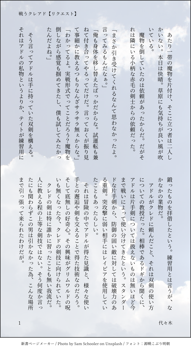 よよぎ☆quiet followDONEファルコムオンリーのエア小説リクエストで頂いたお題。戦うアドルとクレドです!リクエスト頂きありがとうございました🙇♀️※ちょっと気持ちフェルガナネタ入ってたり捏造多いです😇 show all(+13 images) Tap to full screen (size:618x1132).Repost is prohibited Let's send reactions! freqpopularsnackothersPayment processing Replies from the creator Follow creator you care about!☆quiet follow よよぎDONE希望灯/クレアド狂戦士イベ、クレド離脱後すぐの話。クレアドだけどクレイク?(イクリプス王)。クレドさんの心の闇がイクリプス王の形して出てくる描写があります注意 5761 よよぎDONE命に触れる/クレ赤4章入ってすぐくらいの時間軸。王様の髪を手入れするクレドクン。 9196 よよぎDOODLE7月頃〜12月のお絵描きまとめです(鷹赤、ドギアド(?)、クレアド) 8 よよぎDONE【此処にいて/クレ赤/6P】現パロクレ赤です。たまには甘えたクレドくんが見たい!!そう思いました(作文)(当社比) 6 よよぎDONE【幸せのカタチ/クレアド/8P】いい夫婦の日クレアドのつもりで書いたけど、あんまり関係ないようなクレアド。ゲーム軸のアドルくんが旅立つ数日前設定。結婚の誓いごっこしてほしい幻覚。 8 よよぎDONE【泡沫の夢(前編)/クレ赤】ゲーム軸3章終わってすぐくらいの時間軸。人肌が無いとトラウマで眠れないクレドくんと放っておけないアドルくん(王様)。最終的にはクレ赤です。 10737 recommended works rei_17DONE「師が小さくなった件」落書き再録本中国語版ほかの語言版を完成する次第に徐々にアップします 36 Itsuku EntoDOODLEWinnie Auggie ColdFront wip 4 Aslan23418260DOODLE 2018 chibikuraiDOODLEglaring 2 みったんの落書きばこDONE僕らの心臓の止め方/BREAD AND BUTTER 現行未通過× Moca_V_channelSPOILERCoCパラクラ自陣HO2デリクの継続シナリオ「かじ恋」セッションのとあるシーン。KPCと一緒に。イラストby毒毒ちぃの様https://x.com/dkdk_chiinoデリク原案Mikei様:https://mikei.booth.pm/ RinoDONE公式絵のチェンバーが良かったから描いた LaChooWooDONEMetaphor: Re Fantazio Will⚠️ cb dubconpassword: 18+? y/n 2 hxp147258DOODLEエムシーエム欧米風カード収納iphone16/15カバーhttps://foolcase.com/goods-mcm-iphone-15promax-case-236.html