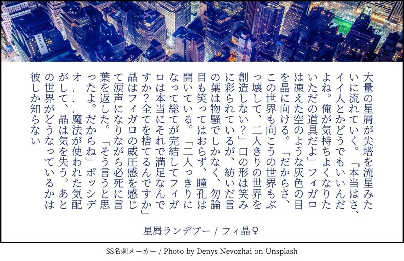 あけさと @souryoni1 あけさと、と申します。ポイピクは名刺メーカーの短文が主になります。pixivでNLや夢小説メインのまほやくや原神の二次創作物の文章書いてます。 ☆quiet follow Yell with Emoji POIPOI 55