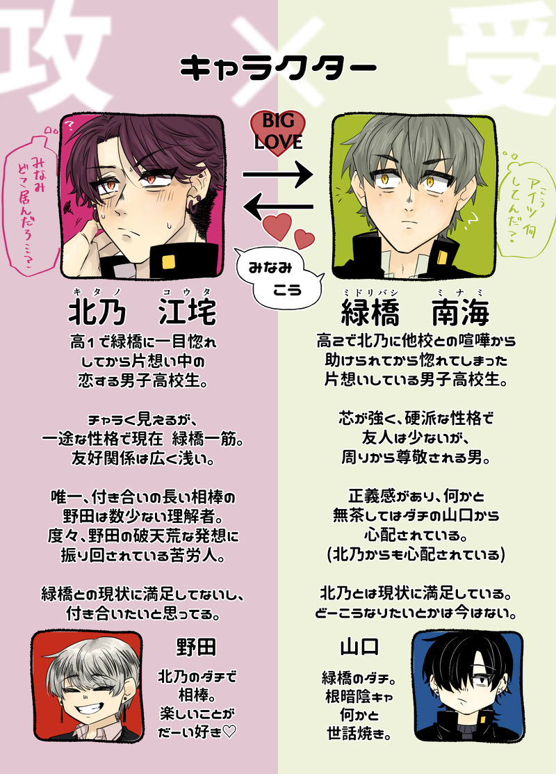 間柄田☆quiet followMAIKING【自創作くびったけ】BL自カプの「江みな」チャラそうに見えて一途な攻×硬派な天然受 show all(+3 images) Tap to full screen (size:5433x7559).Repost is prohibited Let's send reactions! freqpopularsnackothersPayment processing Replies from the creator Follow creator you care about!☆quiet follow 間柄田MEMO一次創作「わちゃっ子」のあらすじと4名のキャラクター詳細が見られます。 2379 間柄田DOODLEOC/村田 狩雨3年前くらいに創ったOCのリメイク。ちょうど1年前にもリメイクしていたらしく、2回目のリメイクでした 3 間柄田DOODLE"I'm a liar...But it's true that I love you."「俺は嘘つきだ…でも、君を愛しているのは事実さ」_____Name : 阿莱 伊月_Arai ItukiAge : 23「誰かと一緒じゃないと寝られない」不眠症に悩まされる男性。_____ 3 間柄田MAIKING【自創作くびったけ】BL自カプの「江みな」チャラそうに見えて一途な攻×硬派な天然受 4 間柄田MAIKING【自創作スキあり】BL自カプの「鳴京」顔が良い喧嘩つよつよ攻×面食いの一匹オオカミ受顔が良い攻めに翻弄される平凡顔の受け。 20 間柄田DONE【自創作】わちゃ4人組それぞれが重め(+面倒くさめ)の過去を持っている、すこーし暗くて、ちょっとコメディな日常を過ごすご機嫌なメンバーたちである!|内容|・キャラ表 ・人物相関図 ・組織図 3 recommended works mainichinemuichDONE相互さんのツイートがあまりに解釈一致だったのでネタをお借りしました。※ご本人に掲載許可いただいています!ありがとうございます!※すけべはありません!ギャグです!弊イデアズにおいても性欲は🐙の方が溜めがち(小出しの発散方法が分からない)だと思っているので、「🐙ちゃんは爆発力がすごくて、スイッチ入ったら野生が目覚めてしまい大変そう」という呟きに飛びついちゃいましたね。(そうですか) 2 favorite774DOODLEワンドロお題拝借「芋」2h、背景素材使用基準としては全年齢のはずだけど下ネタが過ぎるのでワンクッション元ネタは陰陽師 節約したいよ清原DOODLE体調不良キミトスらくがき元気元気おちゃらけ優お兄さんに体調不良が刺さりすぎた魂の方は本当に休んで欲しいですごめんなさい 3 マイトネリウムDOODLE読まなくていいアラビアン設定 2286 ykeanmnPASTヴァージルハッピーバースデー!2022年2月に発行した同人誌「ラモート妄想読本 王立研究院紀要第2022号 The Ecology of Lamort」を全文限定公開します。いつもお付き合いくださり、誠にありがとうございました。今後ともどうぞよろしくお願い申し上げます。 24 ote_100DOODLE2023 Feb. - 2024 Nov.最後に少し🌪️ 45 yuzu_iaiaMEMOCoC「血は氏より育ちて水」KP:私PL:そうた、あんけるちゃん、07氏。HO4をKPCにして回させていただいた〜✌️✌️本当に、格好いいほいほにと、優しいほさんさんでしたねぇ☺️回してて楽しかった〜✌️✌️楽しんでいただけていれば何よりです!長期間、お疲れ様でした! 2 ✨💉🧠🌈🦄✨PROGRESS人魚本とキメセク本の表紙案箔押しなどなどしたいな~~ 2 asukidblue1412DOODLE今日も過去絵からーこの日初めてトーン使いました怪盗キッド「よー名探偵ちょっと付き合えよ」コナン「は?おい離せ」また何かの作戦に使われるコナン笑#Kコ#怪盗キッド#江戸川コナン#DC#DC絵描きさんと繋がり