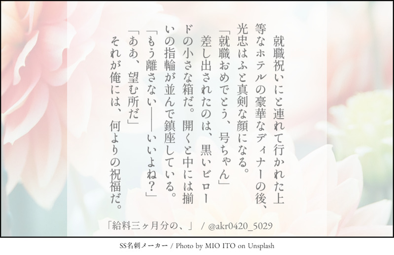 🌟akira🕊☆quiet followTRAINING貴方はakiraの号福で『給料三ヶ月分の、』をお題にして140文字SSを書いてください。※現パロ・大学卒業した号×社会人福の号福(昨日のSSの続きです) #号福 no.Blessing #140文字SS 140-characterSs Tap to full screen (size:910x590).Repost is prohibited Let's send reactions! freqpopularsnackothersPayment processing Replies from the creator Follow creator you care about!☆quiet follow 🌟akira🕊TRAINING貴方はあきもと本丸の号福で『こんなにも愛されている』をお題にして140文字SSを書いてください。※文字数をかなりオーバーしています、、、笑 🌟akira🕊TRAINING貴方はあきもと本丸の🍶🌹で『きっとそれで正解』をお題にして140文字SSを書いてください。※文字数オーバーしています。 🌟akira🕊TRAINING貴方はあきもと本丸の🍶🌹で『はい、あーん?』をお題にして140文字SSを書いてください。 🌟akira🕊TRAINING貴方は明本の号福で『結婚しちゃおっか』をお題にして140文字SSを書いてください。 🌟akira🕊TRAINING貴方はakiraの🍶🌹で『ぐっない、良い夢を』をお題にして140文字SSを書いてください。 🌟akira🕊TRAINING貴方はakiraの号福で『ここから始まる』をお題にして140文字SSを書いてください。 related works 🌟akira🕊TRAINING貴方はakiraの🍶🌹で『捨てられないガラクタ』をお題にして140文字SSを書いてください。※現パロ・号ちゃんがショタです 🌟akira🕊TRAINING貴方は明本の号福で『結婚しちゃおっか』をお題にして140文字SSを書いてください。 🌟akira🕊TRAINING貴方はakiraの号福で『据え膳食わぬは男の恥、だし?』をお題にして140文字SSを書いてください。 🌟akira🕊TRAINING貴方はakiraの号福で『雨も、悪くない』をお題にして140文字SSを書いてください。 氷輪(ひょうりん)DONE金カ夢140文字チャレンジ(11月分)原作程度の流血、下ネタ、不穏等ありますので、ご注意くださいお題はすべてこちらを使用しています140文字SSのお題https://shindanmaker.com/587150 8 有馬晴DONE 有馬晴DONE貴方は有馬晴のコノアサ♀で『ずっとそばにいて』をお題にして140文字SSを書いてください。https://shindanmaker.com/375517 氷輪(ひょうりん)TRAINING140文字チャレンジ9月分書いたら増えていきますR18はありませんが、不穏や事後表現等ごちゃ混ぜです。何でも大丈夫な方のみどうぞお題はすべてこちらを使用しています140文字で書くSSお題https://shindanmaker.com/320966 28 🌟akira🕊TRAINING貴方はakiraの号福で『花言葉で愛を告ぐ』をお題にして140文字SSを書いてください。 recommended works 🌟akira🕊TRAINING貴方はakiraの🍶🌹で『名もない花』をお題にして140文字SSを書いてください。 🌟akira🕊TRAINING貴方はakiraの号福で『ね、狸寝入りさん』をお題にして140文字SSを書いてください。 🌟akira🕊TRAINING貴方はakiraの号福で『酔っぱらいの戯言』をお題にして140文字SSを書いてください。(付き合ってると思ってる号ちゃん×セフレだと思ってる福ちゃん) 🌟akira🕊TRAINING貴方はakiraの🍶🌹で『口説き落としてみせる、って』をお題にして140文字SSを書いてください。 🌟akira🕊TRAINING貴方はakiraの号福で『その言葉が、重い』をお題にして140文字SSを書いてください。 🌟akira🕊TRAINING貴方はakiraの号福で『君を季節に例えるなら、』をお題にして140文字SSを書いてください。 🌟akira🕊TRAINING貴方はakiraの号福で『給料三ヶ月分の、』をお題にして140文字SSを書いてください。※現パロ・大学卒業した号×社会人福の号福(昨日のSSの続きです) 🌟akira🕊TRAINING貴方はakiraの号福で『なんだかなあ、』をお題にして140文字SSを書いてください。 🌟akira🕊TRAINING貴方はakiraの🍶🌹で『君のいない春に眠る』をお題にして140文字SSを書いてください。※🌹ちゃんが修行に行っています