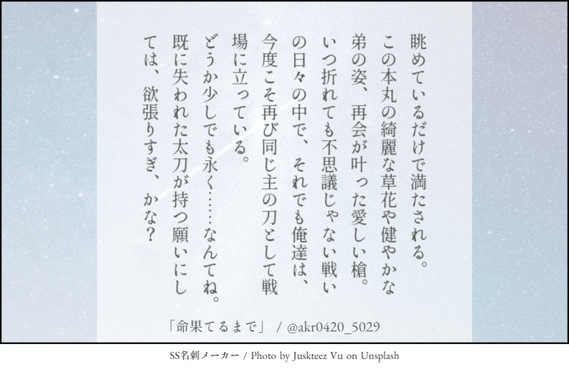 🌟akira🕊☆quiet followTRAINING貴方はakiraの号福で『命果てるまで』をお題にして140文字SSを書いてください。 #号福 no.Blessing #140文字SS 140-characterSs Tap to full screen (size:910x590).Repost is prohibited Let's send reactions! freqpopularsnackothersPayment processing Replies from the creator Follow creator you care about!☆quiet follow 🌟akira🕊TRAINING貴方はあきもと本丸の号福で『こんなにも愛されている』をお題にして140文字SSを書いてください。※文字数をかなりオーバーしています、、、笑 🌟akira🕊TRAINING貴方はあきもと本丸の🍶🌹で『きっとそれで正解』をお題にして140文字SSを書いてください。※文字数オーバーしています。 🌟akira🕊TRAINING貴方はあきもと本丸の🍶🌹で『はい、あーん?』をお題にして140文字SSを書いてください。 🌟akira🕊TRAINING貴方は明本の号福で『結婚しちゃおっか』をお題にして140文字SSを書いてください。 🌟akira🕊TRAINING貴方はakiraの🍶🌹で『ぐっない、良い夢を』をお題にして140文字SSを書いてください。 🌟akira🕊TRAINING貴方はakiraの号福で『ここから始まる』をお題にして140文字SSを書いてください。 related works Lasen73MAIKING顕現したての実休×極燭台切 6270 🌟akira🕊TRAINING貴方はakiraの🍶🌹で『捨てられないガラクタ』をお題にして140文字SSを書いてください。※現パロ・号ちゃんがショタです 🌟akira🕊TRAINING貴方はakiraの号福で『花言葉で愛を告ぐ』をお題にして140文字SSを書いてください。 🌟akira🕊TRAINING貴方は明本の号福で『結婚しちゃおっか』をお題にして140文字SSを書いてください。 🌟akira🕊TRAINING貴方はakiraの号福で『雨も、悪くない』をお題にして140文字SSを書いてください。 ゆばばDOODLE号福になる予定の号+燭SS(800字くらい)福不在続く予定だったけどひらめきが足りないので一旦ここまで 2 o_matchaREHABILI※モブ視点※現パロか現代潜伏任務中かはご自由に 6431 🌟akira🕊TRAINING貴方はakiraの号福で『据え膳食わぬは男の恥、だし?』をお題にして140文字SSを書いてください。 221012_chanDOODLE号福🔞🌹ちゃん🐄コスチューム...⚠️母乳⚠️アヘガオ18⬆️? (yes/no) recommended works o_matchaREHABILI※モブ視点※現パロか現代潜伏任務中かはご自由に 6431 🌟akira🕊TRAINING貴方はakiraの🍶🌹で『名もない花』をお題にして140文字SSを書いてください。 🌟akira🕊TRAINING貴方はakiraの号福で『酔っぱらいの戯言』をお題にして140文字SSを書いてください。(付き合ってると思ってる号ちゃん×セフレだと思ってる福ちゃん) 🌟akira🕊TRAINING貴方はakiraの号福で『甘やかしてよ』をお題にして140文字SSを書いてください。 🌟akira🕊TRAINING貴方はakiraの号福で『だれにもおしえてあげないよ。』をお題にして140文字SSを書いてください。 🌟akira🕊TRAINING貴方はakiraの号福で『心臓が痛い』をお題にして140文字SSを書いてください。 🌟akira🕊TRAINING貴方はakiraの号福で『強い人』をお題にして140文字SSを書いてください。 🌟akira🕊TRAINING貴方はakiraの号福で『本気にしないよ、それでいい?』をお題にして140文字SSを書いてください。 🌟akira🕊TRAINING貴方はakiraの号福で『朝四時、ランデブー』をお題にして140文字SSを書いてください。