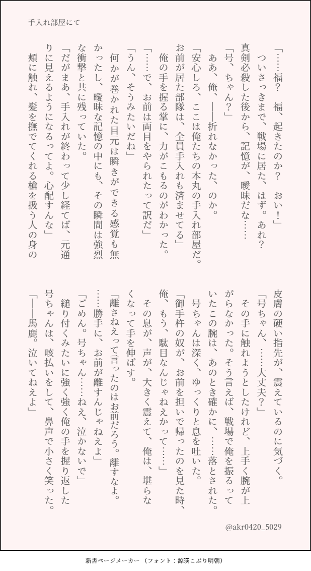 🌟akira🕊☆quiet followMOURNING手入れ部屋にて / 号福重傷で帰還した福ちゃんと、それを本丸で迎えた号ちゃんのはなし※傷が治りきってない(怪我・欠損?表現は有りますが手入れ中で痛いわけじゃなさそう)※かっこいい号ちゃんは居ません。居ません!!!!!!!!!※書きたいところだけ書きました。突然終わる。 #号福 no.Blessing Tap to full screen (size:618x1132).Repost is prohibited Let's send reactions! freqpopularsnackothersPayment processing Replies from the creator Follow creator you care about!☆quiet follow 🌟akira🕊TRAINING貴方はあきもと本丸の号福で『こんなにも愛されている』をお題にして140文字SSを書いてください。※文字数をかなりオーバーしています、、、笑 🌟akira🕊TRAINING貴方はあきもと本丸の🍶🌹で『きっとそれで正解』をお題にして140文字SSを書いてください。※文字数オーバーしています。 🌟akira🕊TRAINING貴方はあきもと本丸の🍶🌹で『はい、あーん?』をお題にして140文字SSを書いてください。 🌟akira🕊TRAINING貴方は明本の号福で『結婚しちゃおっか』をお題にして140文字SSを書いてください。 🌟akira🕊TRAINING貴方はakiraの🍶🌹で『ぐっない、良い夢を』をお題にして140文字SSを書いてください。 🌟akira🕊TRAINING貴方はakiraの号福で『ここから始まる』をお題にして140文字SSを書いてください。 related works 🌟akira🕊TRAINING貴方はakiraの号福で『花言葉で愛を告ぐ』をお題にして140文字SSを書いてください。 🌟akira🕊TRAINING貴方は明本の号福で『結婚しちゃおっか』をお題にして140文字SSを書いてください。 🌟akira🕊TRAINING貴方はakiraの号福で『雨も、悪くない』をお題にして140文字SSを書いてください。 🌟akira🕊TRAINING貴方はakiraの🍶🌹で『捨てられないガラクタ』をお題にして140文字SSを書いてください。※現パロ・号ちゃんがショタです 221012_chanDOODLE号福🔞🌹ちゃん🐄コスチューム...⚠️母乳⚠️アヘガオ18⬆️? (yes/no) o_matchaREHABILI※モブ視点※現パロか現代潜伏任務中かはご自由に 6431 ゆばばDOODLE号福になる予定の号+燭SS(800字くらい)福不在続く予定だったけどひらめきが足りないので一旦ここまで 2 Lasen73MAIKING顕現したての実休×極燭台切 6270 🌟akira🕊TRAINING貴方はakiraの号福で『据え膳食わぬは男の恥、だし?』をお題にして140文字SSを書いてください。