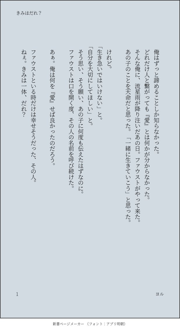 yoru_012☆quiet followDONE【mhyk】フィ視点『きみはだれ?』フィ→ファ→アレの一方通行 #まほやく mahayanaMahaparinirvanaSutra #フィガロ figaro #ファウスト faust Tap to full screen (size:618x1132).Repost is prohibited Let's send reactions! freqpopularsnackothersPayment processing Replies from the creator Follow creator you care about!☆quiet follow yoru_012SPOILER7/13(日) 星に願いを 2025 -day2- にて無料配布した、短編小説「いつかの記憶」です。こちらは、新刊「蒼穹の記憶、星の約束」の内容を含んでおります。本編を読む前に見ても、読んだ後に見ても楽しめる内容となっていますので、それぞれお好きなタイミングでご覧ください。 yoru_012SPOILERせんせい時間6 にて無料配布した、新刊『テラリウムの祈り』の小説(番外編)になります。【内容】・孤独の毒吐く(フィガロ視点)・猫たちの悪戯(とある人物たちのお話)⚠新刊のネタバレが含まれていますので、閲覧の際はご注意ください。pass:イベント開催日の月日 4桁 11 yoru_012DONE友達への布教用に作りました。よければダウンロードして使ってください。 10 yoru_012DONE『嘘つき』 yoru_012DONE【mhyk】フィ視点『きみはだれ?』フィ→ファ→アレの一方通行 related works ローズベルDOODLEフィガファウ「パレード」元絵動くのはこっちhttps://twitter.com/rosecainbell/status/1353170934543249408?s=20 ローズベルDOODLEかつて砕けた希望(ファウスト)#まほやく_FA 真夜中REHABILIファウストさま おかきMAIKING SHIN_TamazukiDOODLEFaustception 2 ginnnnijiDONEファウスト先生のお誕生日用に描いて大遅刻したものおめでとうございました! m5_blDOODLE具合悪いファウスト SHIN_TamazukiDOODLEFaust getting jumpscared by pp 2 きろくDONE大正ロマンみある服きてほしい recommended works はるのDOODLE 2 ゆぬいDOODLE朝のお絵描き。 瞬ひかりDONE『星空の洋服』宝石を散りばめたかのような星空を、洋服に。 4 ゆめちゃんDONE幸せに酔いしれてね しお🧂MOURNING過去フィガファウの蛇足 全部漫画で表現できるようになりたいな 4 ぬず@nuzuo0DONE加工迷った。結局はツイッターにあげた方の青が強いのに決まってこれはぼつになりました。 カブラヤDONEソファでくつろいでいるところ、たまたま(じゃないかもしれない)通りがかったオズを見つけて笑顔がこぼれる ichiDONEあの描き下ろし現代衣装が可愛くてつい漫画描いてしまった!本編の前の賢者様エピソードがどれも面白すぎて大好き。それを素直に信じてしまう魔法使い達(特にアーサー)も可愛くて好き😂正しく教えてくれたり良い事言ってくれる時もあるのに、微妙に事実を曲げて現代知識教えてるんだよな‥(笑) 4 aoju_aojuDOODLEシノかっこよかった