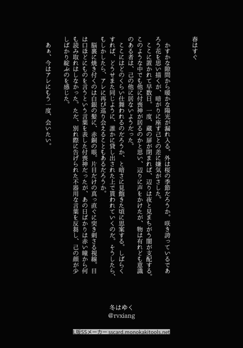 rvxiang(フラン)☆quiet followDONE冬はゆく(鬼典)春夏秋冬/喜怒哀楽/視聴嗅触※再編集しました show all(+3 images) Tap to full screen (size:954x1365).Repost is prohibited Let's send reactions! freqpopularsnackothersPayment processing Replies from the creator Follow creator you care about!☆quiet follow rvxiang(フラン)DONE雪ならざる花(大典太)王安石「梅花」より rvxiang(フラン)DONE神楽坂でランチを(モブ典←鬼、鬼典)⚠現パロ⚠みつよさんがダメンズウォーカー 4 rvxiang(フラン)DONE春愁(鬼典) rvxiang(フラン)DONE晴天風花(大典太)2022年 国宝指定記念日 rvxiang(フラン)DONEバッセンデート(ミュ鬼典)ミュくにつなの幻覚を見始めている 2 rvxiang(フラン)REHABILIおにでんの日!!!!!!! 5811
