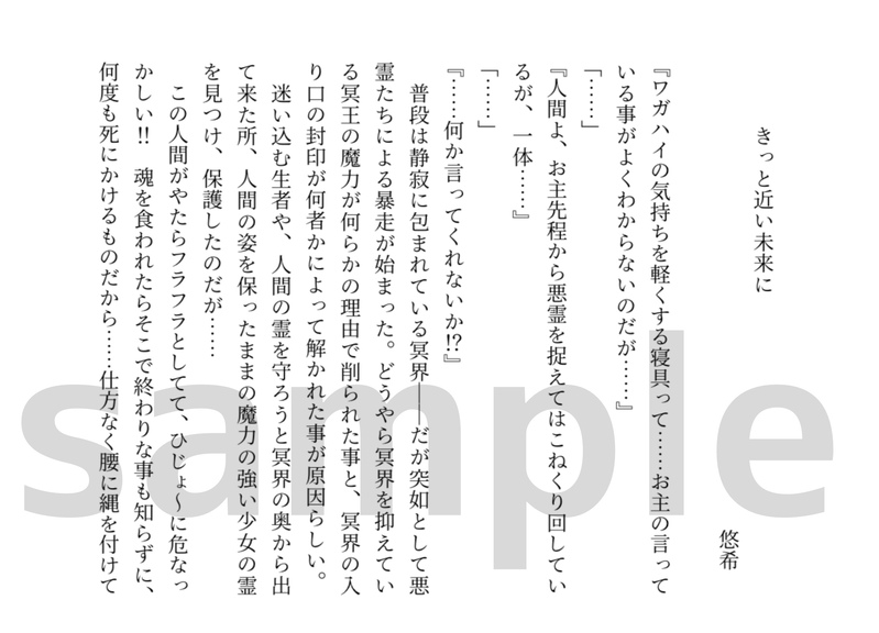 魔王様生誕記念アンソロジー本部☆quiet followINFOサンプル▶︎ゲスト 悠希 様(@haruharuki2)小説の寄稿を2本いただきました!こちら1本目のサンプルとなります。明日2本目を掲載させていただきます。 #魔王城でおやすみ #アンソロジー企画 anthologyProject #サンプル sample #小説 novel Tap to full screen (size:2191x1579).Repost is prohibited Let's send reactions! freqpopularsnackothersPayment processing Replies from the creator Follow creator you care about!☆quiet follow 魔王様生誕記念アンソロジー本部INFO魔王様生誕記念アンソロジーの詳細が決定しました!総執筆者数24名(ゲスト寄稿者様22名)総ページ数190(本文186ページ、カラーイラスト4ページ)箔押しや特殊加工を盛り込んだ厚さ1.3センチのかわいい鈍器です!スペースNo.などは追って告知致します。(5月下旬予定) 5 魔王様生誕記念アンソロジー本部INFOサンプル▶︎ゲスト 京尺 様(@kyosyaku06)アナザー魔王城のシリアス漫画を寄稿していただきました!(アカツキ+タソガレ、のろいのおんがくか+タソガレ要素を含みます) 魔王様生誕記念アンソロジー本部INFOサンプル▶︎ゲスト 🍁 様(@kochanioboretai)勇者アカツキ×魔王タソガレのしっとりとした小説をご寄稿いただきました! 魔王様生誕記念アンソロジー本部INFOサンプル▶︎ゲスト マザー 様(@riry_blood)魔王様メイン、オールキャラほのぼのコメディ漫画の寄稿をいただきました! 魔王様生誕記念アンソロジー本部INFOサンプル▶︎ゲスト tsumuko 様(@tsumuko_neko)魔王様メインのオールキャラ漫画の寄稿をいただきました! 魔王様生誕記念アンソロジー本部INFO主催▶︎こま タソガレウシミツ親子のほのぼの漫画です related works kabolove22DONESSメーカーで作った小説です。 8 siro1516TRAINING『小さな子供との夏祭り編』2/2枚 10 かほる(輝海)PROGRESSエアコミアンソロ進捗。やっと攻守交代まで来た(*´艸`*)そして、一番言わせたかったセリフまできた…あぁ満足…まだ終わらないよ(*´ω`*)肝心のセリフに字が重なってる…(´・ω・`)タップすると全部見えるようになります。 zeppei27DONEなんとなく続いている主福のお話で、単品でも読めます。七夕を楽しむ二人と、夏の風物詩たちを詰め込んだお話です。神頼みができない人にも人事を超えた願いがあるのは良いですね。>前作:昔の話https://poipiku.com/271957/11735878.htmlまとめhttps://formicam.ciao.jp/novel/ror.html 3654 ももみつDONEマターさんとクラフターさんの、日常の一コマ話。小説。 9 文月ちえり&中の人MAIKING作業進捗?みたいな感じの投稿だけど、現在Newお仕事に夢中で絶賛放置中な執筆中小説の一つ。第1章の序盤で、サイトにて公開中な10,000文字の約半分相当です。#青春 #小説 #中学生 #オリジナル#自家製本 して書籍化予定です!#文学フリマ #前橋 #東京 #文フリ 出店予定 14 siro1516INFO先程お伝えした「小さな炭治郎くんと義勇さん」からのご挨拶と「お知らせ」を別で投稿です。 4 かほる(輝海)INFO平成最後にネップリ折本出します。A6サイズ8ページ。R18小説を二本収録。そのうち一つは、ここで公開済みの「路地でもっこりする二人の話」です。コードは29日の夜遅く(30日に日付が変わる頃)に支部で公開します。サンプルで1ページだけチラ見せ。よろしくお願いいたします。 starareorangedrDONE恭龍の小説(まだつきあってない) 3