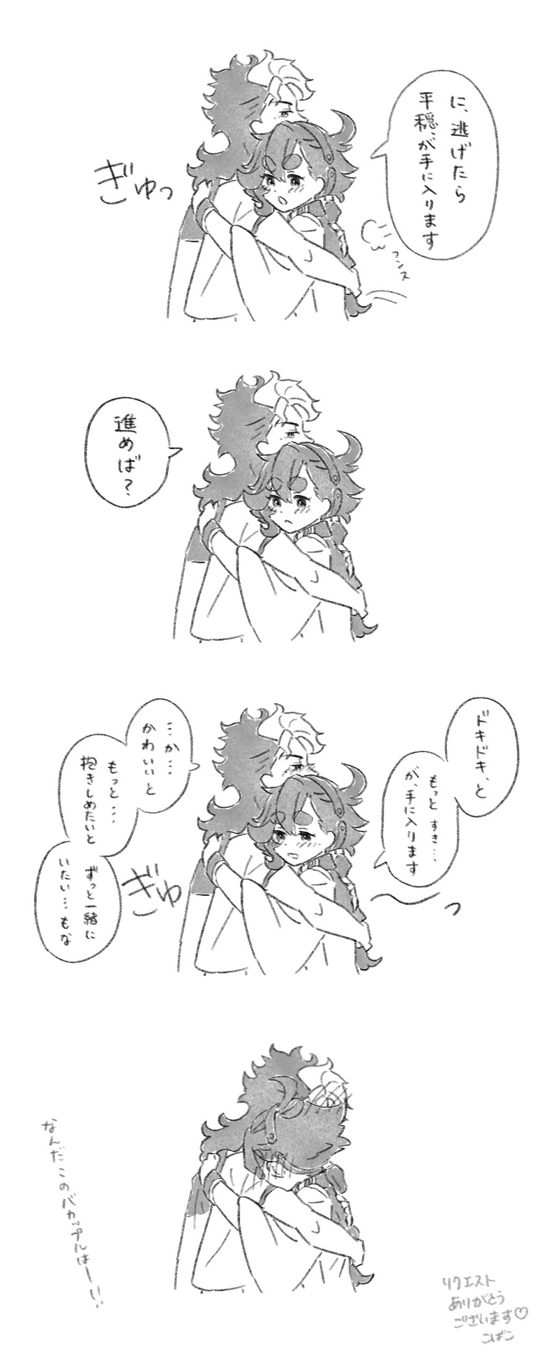 こばこ☆quiet followDONEエアスケブ4枚目「イチャイチャする(でもやっぱ恥ずかしい)グエスレ」リクエストいただきました!こうであってますか!!!!???こんなに甘々なグエスレを描くことになるとは思ってませんでした。クリックで2枚目おまけもあります。素敵なリクエストありがとうございました…!!! show all(+1 images) Tap to full screen (size:900x2200).Repost is prohibited Let's send reactions! freqpopularsnackothersPayment processing Replies from the creator Follow creator you care about!☆quiet follow こばこSPOILER【サンプル】新刊口絵2,3p【🔑公開】6/30ジュンブラ新刊「すいせいのフラワーワールド」の口絵サンプルです本来は手にして頂いてからのお楽しみ…!を想定していたのですが、検討されている方へのご参考になればと思い、見たい方だけ事前に見れる形にしました(サンプルフィルターはかけています)※見なくても大丈夫!の方は「お手元に届くまでのお楽しみ」を推奨です🔑:630 こばこDONE【絵チャ】グエスレバレンタイン絵チャ会遊びに来てくださった方、ありがとうございました~!すごく可愛い~!!!😍✨✨とっても豪華で素敵な一枚になりました感謝です🙏💝タイムラプスもよかったらどうぞ🎥https://v.kuku.lu/6557c5c0b3※一部消しゴムで消えちゃったところがあったので、こちらで修正しておきました!すみません🙏💦 こばこDONE【ネップリ】2パターン🌺🌻🎆🎇華まつり企画で投稿する予定だった作品ですグエルの短髪、長髪の2種あります※印刷期間は終了いたしましたお手に取ってくださった方、ありがとうございました…!✨プレキミ、楽しかったです!💎✨ 2 こばこDONE【4コマ】グス+ラゆる漫画「スレッタのサンタ大作戦」グエスレ前提。スレッタもラウダもちょっとヘンタイさんです。グエルは光が増してます(当社比)。そんな3人のわちゃギャグ漫画クリスマスバージョンです🎄前回のWEBオンリー展示版https://poipiku.com/6818142/8982077.html 7 こばこDONE【小説】現パロ転生グエスレシリーズ「すいせいのフラワーワールド」第3話『飛び込め!』シリーズはじめ→https://poipiku.com/6818142/8982081.htmlスレッタからのメッセージに返信しないまま、一週間が経とうとしていた。かつての"約束"との間で揺れ動くグエルはーー。前半グエルside、後半スレッタsideです 19 こばこDONE【小説】現パロ転生グエスレシリーズ「すいせいのフラワーワールド」第2話『指先で送る君へのメッセージ』バスでグエルとの出会いがあった夕方、興奮気味に学校から帰宅したスレッタ。彼への興味が尽きない気持ちを、同じ屋根の下で暮らす義妹[いもうと]に打ち明ける。ソフィ、ラウダ登場。前半スレッタside、後半グエルsideです 16