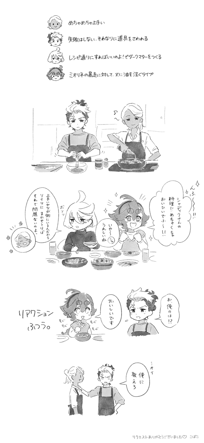 こばこ☆quiet followDONEエアスケブ10枚目「グエスレシャディミオで料理」リクエストいただきました!ネタが降ってきたので、またしてもスケブ範疇超えました☺️楽しかった!料理の腕前は完全にわたしの想像です。グエルに対して天然で塩対応するスレッタが好きです。リクエスト、ありがとうございました…!!! Tap to full screen (size:1450x3150).Repost is prohibited Let's send reactions! freqpopularsnackothersPayment processing Replies from the creator Follow creator you care about!☆quiet follow こばこSPOILER【サンプル】新刊口絵2,3p【🔑公開】6/30ジュンブラ新刊「すいせいのフラワーワールド」の口絵サンプルです本来は手にして頂いてからのお楽しみ…!を想定していたのですが、検討されている方へのご参考になればと思い、見たい方だけ事前に見れる形にしました(サンプルフィルターはかけています)※見なくても大丈夫!の方は「お手元に届くまでのお楽しみ」を推奨です🔑:630 こばこDONE【絵チャ】グエスレバレンタイン絵チャ会遊びに来てくださった方、ありがとうございました~!すごく可愛い~!!!😍✨✨とっても豪華で素敵な一枚になりました感謝です🙏💝タイムラプスもよかったらどうぞ🎥https://v.kuku.lu/6557c5c0b3※一部消しゴムで消えちゃったところがあったので、こちらで修正しておきました!すみません🙏💦 こばこDONE【ネップリ】2パターン🌺🌻🎆🎇華まつり企画で投稿する予定だった作品ですグエルの短髪、長髪の2種あります※印刷期間は終了いたしましたお手に取ってくださった方、ありがとうございました…!✨プレキミ、楽しかったです!💎✨ 2 こばこDONE【4コマ】グス+ラゆる漫画「スレッタのサンタ大作戦」グエスレ前提。スレッタもラウダもちょっとヘンタイさんです。グエルは光が増してます(当社比)。そんな3人のわちゃギャグ漫画クリスマスバージョンです🎄前回のWEBオンリー展示版https://poipiku.com/6818142/8982077.html 7 こばこDONE【小説】現パロ転生グエスレシリーズ「すいせいのフラワーワールド」第3話『飛び込め!』シリーズはじめ→https://poipiku.com/6818142/8982081.htmlスレッタからのメッセージに返信しないまま、一週間が経とうとしていた。かつての"約束"との間で揺れ動くグエルはーー。前半グエルside、後半スレッタsideです 19 こばこDONE【小説】現パロ転生グエスレシリーズ「すいせいのフラワーワールド」第2話『指先で送る君へのメッセージ』バスでグエルとの出会いがあった夕方、興奮気味に学校から帰宅したスレッタ。彼への興味が尽きない気持ちを、同じ屋根の下で暮らす義妹[いもうと]に打ち明ける。ソフィ、ラウダ登場。前半スレッタside、後半グエルsideです 16