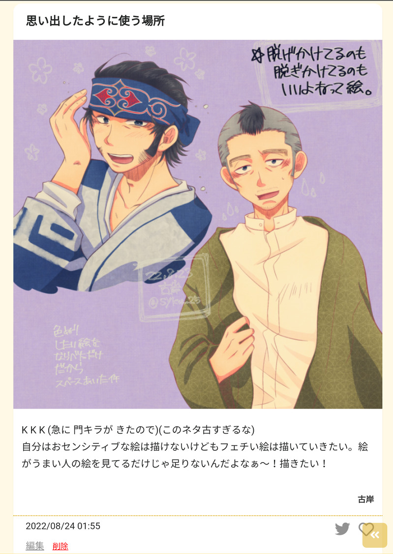 古岸@しまよう☆quiet followDOODLE2022年の最後の祭り(全話無料公開)からの見事な大団円に心が鷲掴みされてゴールデンカムイにハマり、ゆるやかに門倉とキラウㇱ沼に沈んで今(2023年6月現在)に至っております。おっさん!なかよし!いい!!! show all(+3 images) Tap to full screen (size:1440x2030).Repost is prohibited Let's send reactions! freqpopularsnackothersPayment processing Replies from the creator Follow creator you care about!☆quiet follow 古岸@しまようDONEバランスなんて知らんな絵になりましたが、在ってくれてありがとうの思いを込めて…!そして相変わらず、マルコの良さを急に本編と外堀でもりもり表現して埋めてくるこの世界よッッッ数年おきにくらってる!!! 古岸@しまようDONE元になったトレス可構図からだいぶ離れた絵になりました!何故!入れた文は地味に続けているぶれおだで、ファイナルシーズンライナーがこの2人をこんな感じで表してたのを見て改めておおん…となったので…ゲームでもお辛いを繰り返すのなんなの() 古岸@しまようDONE愛は引力と聞きました!!!(?)描きたかったトレス可構図と某魔王様のブラシが合致してくれました ありがたい!!!親友は不滅です…!!! 古岸@しまようPAST進撃映画でスクカーマルコを見た方が「やっぱり服の色、青だよね!(*´ω`*)」って言ってらっしゃって、過去描いた記憶がある現在のわたしが「そっか~、緑のイメージもあるな~(*´ω`*)」と描いた絵を見直したら、なんか緑ですらなかったのがびっくりしたので再投稿。2020年のわたしよ、どうして…? 古岸@しまようDOODLE久々に絵を描いた(真顔)自分にしか分からないけれども、えっちな雰囲気を込めて描くとやる気が出ますね! 古岸@しまようDONE暑さからの逃避で描いた門キラ。トレス可素材をお借りしてます。添えてある文は…意味ないです…なんか文字入れたくてひりだしました…いい表情は描けた気がする。 recommended works pimetsuDOODLEガチ落書きまみれですピクトセンスの画像はととりりさんにいただきました🙏またやりた~い❣️おばみつ風味な絵がちとあります! 10 POI9897959DOODLE まぐろPROGRESS🔞むちむち mtz_m_aDOODLE #仁Dプラスバイ┣先によく来るお客さんが、よく見ると実はカッコ良かった。 Daokhongnit_0302DONE18⬆️?Yes/No 34 stamp(0,0,0)DOODLE正月衣装わんどろ mumusubi_INFOこちら、ゆゆゆ様(X:@yuyuyu04100904)に描いていただきました!!!!!!3646&5626スモロのお話のスモロです!!!!!!ゆゆゆさんの56スモ、あまりにもイケすぎて声が出ました😭!!!!ふ……って笑むスモ、セクシーエチエチダンディすぎてこんな、もう視線だけで完堕ちでは?!?!(ロ〜くんが)よすよすのコマの可愛さで涙出る……本当にありがとうございました……🙇♀️!!!!! tukiedaV2DOODLE現パロ配曲。脳受信しちゃったので…… Bee_Signal_yumeDONEビーくんとシグナルがクリスマスに美味しいものを食べる話です。(血・暴力表現注意)※力/デ/シ/ュ非参加・受動喫煙者の二次創作です ※死亡描写有 3031