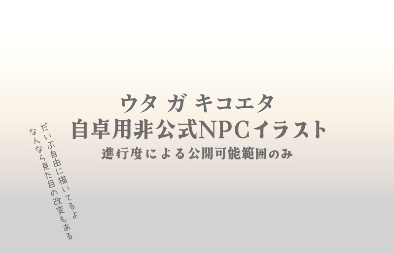 hachiue_game☆quiet followTRAININGCoC『ウタ ガ キコエタ』 自卓用非公式NPCイラスト ※ネタバレ注意完全非公式、自分がセッションしたくて描いてたものです。現在進行形の卓が進んだら更新…できたらいいな…。 #ウタガキコエタ #NPC #非公式 non-formula show all(+2 images) Tap to full screen (size:1500x965).Repost is prohibited Let's send reactions! freqpopularsnackothersPayment processing Replies from the creator Follow creator you care about!☆quiet follow hachiue_gameDONE【狂天或叶】追加立ち絵 4 hachiue_gameMOURNING【旅館の捕食者】自陣探索者らくがき※未通過NG ※微ホラー注意 2 hachiue_gamePROGRESS【狂天或叶】立ち絵進捗【線画終わったよ】 hachiue_gamePROGRESS進捗。ポーズが無理あるんじゃないかと思って描き直しをしてる素体あるので一応R-18。 hachiue_gamePROGRESS【狂天或叶】立ち絵進捗【休日しか作業進まねぇ】 hachiue_gameDONE旅館の捕食者 HO3 薬袋蒼佑リハビリテーション科所属の看護師です。 related works かすがさんDOODLEこれはデキてる貴理の職場のご褒美キっス kayunodaburu1DOODLE創作季節精霊のSky×人魚【一回消して再載しました。】 5 8x4ha32DOODLE第一弾映画の轟+百(特に内容はない) 2 yuusumikasuminSPOILER #スターヒーローズ 聖地巡礼してきたよレポ!個人的考察やらネタバレ含みますのでご了承ください! 11 坂島(@sinps1212)MEMO土岐隼一特製トレーディングカード「GAZE」で遊びたい人向けの、アレンジ(非公式)ルールを作りました。ファンによる個人作成のため、公式様への問い合わせなどはせず、個人の範囲で遊んで下さい。プレイマットはA4サイズで印刷してください。線画の方はアレンジしたい人向けです。連絡なしで自由に使って下さい。表は勝ち負けの判定が分からない人向け。 8 hachiue_gameTRAININGCoC『ウタ ガ キコエタ』 自卓用非公式NPCイラスト ※ネタバレ注意完全非公式、自分がセッションしたくて描いてたものです。現在進行形の卓が進んだら更新…できたらいいな…。 3