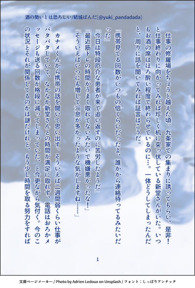 結城ぱんだ☆quiet followDONE【新玲】酒の勢いとは恐ろしい診断メーカーの結果を参考に書きました(*'ω'*)いつもはしぶにしかあげないんですけど、今回試しについったーとぽいぴくにも投げてみます😊 #スタマイ #新玲 show all(+5 images) Tap to full screen (size:630x928).Repost is prohibited Let's send reactions! freqpopularsnackothersPayment processing Replies from the creator Follow creator you care about!☆quiet follow 結城ぱんだREHABILI玲ちゃんが自分で気づかないくらいのことを気付いてサラッとフォローする渡部さん。流石だなぁ。 6 結城ぱんだREHABILIリ…リハビリ……? 結城ぱんだPROGRESSリハビリ…………わたれ~ちゃんで書きたいけど書けるか不安 結城ぱんだTRAINING1XXKm/h【清玲】ギャグです、多分。 2 結城ぱんだMAIKINGたったそれだけなのに。/カナ玲続き書けたらいいね(希望的観測) 2 結城ぱんだMOURNING思いやりの欠片/清玲(新玲)玲ちゃん鈍感気味なので地雷だったら避けてね🤟🤟🤟 2 related works 小夜の倉庫DONE「白に包まれ」(宮玲)/2018.2.19本編未完結の時期に書いたものなので、しんどい感じになっています。 4 カヤコDONEstmyイメージお題企画よりお借りしたお題で♡耀玲×2、関玲、渡玲の4話 6 saya_starmoonDOODLEお試しぽいぽい。司玲ちゃん。#スタマイ 雨音 鈴DONE桧山さん🎉お誕生日おめでとう!!ギリギリ間に合った~ペン入れはアナログでやってみました。いつも桧山さんの言葉に励まされます。強さとは、温かさであり、優しさ。これからも桧山さんを応援していきたいなぁ。 小夜の倉庫DONE「恋は人を愚かにする」(誠玲)/2018.1.21誠玲も増やしたい……。 6 うめ@眠いPASTお試しで過去絵#スタマイ #宮瀬豪 小夜の倉庫DONE「Marking」(潔玲)/2018.3.2プライベートでの潔くんの嫉妬台詞があまりにエモかったので。 5 jun_horai0111swDONEフォロワーさんとの企画で、「春」と「ほんわか」のテーマで書いた蒼玲ちゃんです❤素敵なタイトルをフォロワーさんに考えてもらいました~(∩˘ω˘∩ )♡ 4 jun_horai0111swDONE初書き宏玲初デート(仮)の一幕とでも思って頂ければ|*・ω・) 2