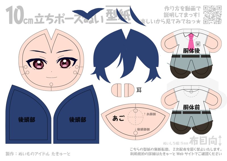 ぬい作り日記①七浦すばる君のぬいぐるみがないのでおとちゃんがかわいそうなので作ることにしました。おとめぬいが殆どプリントだったので日光企画池袋同人工房のぬい布プリントを利用して作ろうと思いました。通販はないので池袋で直接プリントします。データはたきゅーとちゃんの型紙を元に顔や服、髪を描きました。クリスタで充分できます。データに不備がなければ店員さんに教えてもらえば簡単でした。※毛流れは要注意
