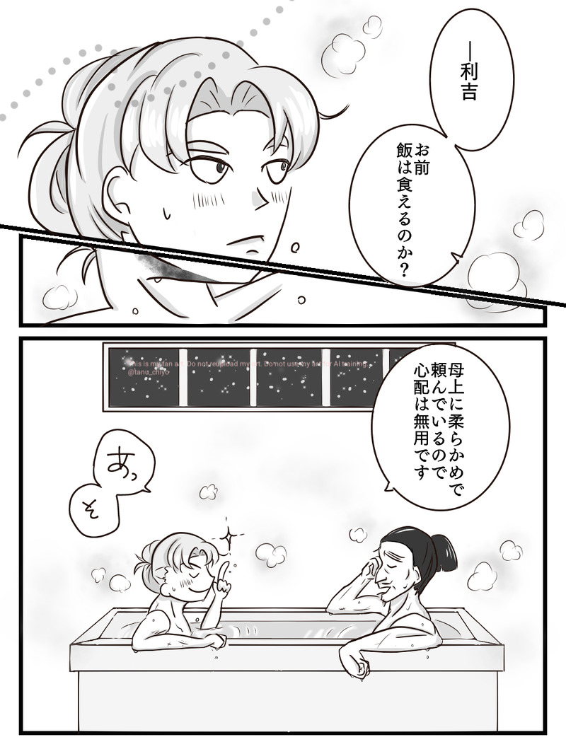 軍師すぐ後くらいのイメージ。親子がお風呂でおしゃべりしています。