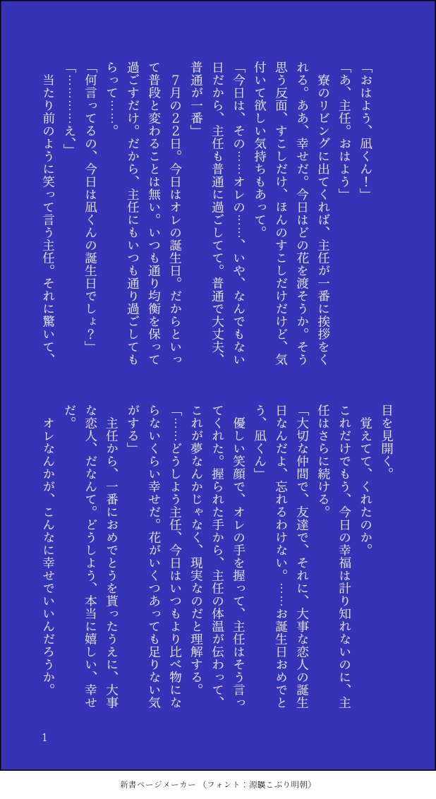 名は無い☆quiet followPAST人生最高の誕生日/楓凪朝から楓くんに祝って貰えて嬉しくて泣いしまう凪のお話です show all(+2 images) Tap to full screen (size:618x1132).Repost is prohibited Let's send reactions! freqpopularsnackothersPayment processing Replies from the creator Follow creator you care about!☆quiet follow 名は無いDONEたまにはゆっくり二人きり/楓生久しぶりのデート、かと思いきや仕事の話ばかりになってしまう生行と、それにもやもやしてしまう楓くんの話です 最後はイチャついてます🌊箱にてリクエスト頂いたものを展示させていただきます!本当にリクエストありがとうございます……無限に募集してたりしますので良ければぜひ読了後推奨?↓この後はのんびり二人で映画を見た。翌日の生行はいつにも増して仕事が速かったらしい。 4 名は無いDONE守りたいなんて、そんな戯言/楓琉守りたいと言われて、不覚にもときめいてしまった琉衣の話です。よろしくお願いします読了後推奨↓翌日、いつも通りに見せ掛けつつ、楓に対して動揺してしまう琉衣に気付いた糖衣が、詳しく話を聞いて「兄様に好きな人……!しかも主任さん!これはもう、応援するしかない……!!」と言って燃えている姿が見られたり、見られなかったり。 3 名は無いDONE酒は飲んでも飲まれるな!/楓可不珍しくかなり酔ってしまった楓くんを介抱(?)する可不可のお話です。ちょっとセンシティブなので背後注意読了後推奨↓しばらくして起きた楓くん。可不可に抱き締められて、当の本人はもう寝てしまっていて。混乱しながらも可不可をベッドに寝かせる。翌朝には可不可から「楓ちゃんのばか! 変態!」と怒られてさらに混乱する楓くんでした。 3 名は無いDONE俺たちは戦友であり、/楓來まさかまさかの楓くんに恋をしてしまった來人のお話です。おまえが好きになるんかーい読了後推奨↓お付き合い成立したあとは、それはもうみんなに見せつけるかのように(無自覚)イチャつくしくっつくしで楓くんのことが好きな人達はメンタルブレイク待ったなし。生行にも怒られてしまう始末。けれどこれは本心なんだから、仕方ないだろう? なあ楓。なんて笑顔で言うからたまったもんじゃない 7 名は無いDONE未成年淫行ダメゼッタイ!/楓あくそういう夢を見てしまったあく太と、何も知らない楓くんのお話です。背後注意読了後推奨↓口に出さないことに成功したとしても、態度に丸出しなあく太(16)。楓くんには、ちょっと緊張してしまっていつものように抱きついたりが出来なくなることもあり、七基に爆速でバレる。おでん組はライバルたり得るのか。高校生バトル、開催。なおダークライポジに可不可達がいることも忘れずに。 3 名は無いDONE笑えない冗談/楓添いつの間にか楓くんに恋をしてしまっていた添のお話です。区長ノベル読了後推奨めちゃくちゃ短くて申し訳ない読了後推奨↓添は少しずつ距離を縮め、最後にバクッ!っといくタイプだと思っているので、練牙のときと同じように飲みに誘ったり、泥酔させて自分への気持ちを聞いたりしてると思います。楓くんを狙うとなると、恋敵が随分と多いですが、まあ、彼ならきっと上手くやるんでしょうね 2