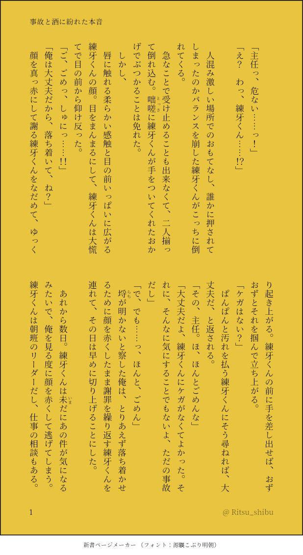 名は無い☆quiet followDONE事故と酒に紛れた本音/楓練事故でキスしてしまった楓練、そこからお付き合いに発展するまでのお話です読了後推奨↓このあと本当に可不可によってお酒弱い組に講習が行われました。講師は朔次郎。可不可も生徒です。みんなで清く正しいアルコールライフを送りましょうね。飲みすぎダメ絶対。 show all(+8 images) Tap to full screen (size:618x1132).Repost is prohibited Let's send reactions! freqpopularsnackothersPayment processing Replies from the creator Follow creator you care about!☆quiet follow 名は無いDONEたまにはゆっくり二人きり/楓生久しぶりのデート、かと思いきや仕事の話ばかりになってしまう生行と、それにもやもやしてしまう楓くんの話です 最後はイチャついてます🌊箱にてリクエスト頂いたものを展示させていただきます!本当にリクエストありがとうございます……無限に募集してたりしますので良ければぜひ読了後推奨?↓この後はのんびり二人で映画を見た。翌日の生行はいつにも増して仕事が速かったらしい。 4 名は無いDONE守りたいなんて、そんな戯言/楓琉守りたいと言われて、不覚にもときめいてしまった琉衣の話です。よろしくお願いします読了後推奨↓翌日、いつも通りに見せ掛けつつ、楓に対して動揺してしまう琉衣に気付いた糖衣が、詳しく話を聞いて「兄様に好きな人……!しかも主任さん!これはもう、応援するしかない……!!」と言って燃えている姿が見られたり、見られなかったり。 3 名は無いDONE酒は飲んでも飲まれるな!/楓可不珍しくかなり酔ってしまった楓くんを介抱(?)する可不可のお話です。ちょっとセンシティブなので背後注意読了後推奨↓しばらくして起きた楓くん。可不可に抱き締められて、当の本人はもう寝てしまっていて。混乱しながらも可不可をベッドに寝かせる。翌朝には可不可から「楓ちゃんのばか! 変態!」と怒られてさらに混乱する楓くんでした。 3 名は無いDONE俺たちは戦友であり、/楓來まさかまさかの楓くんに恋をしてしまった來人のお話です。おまえが好きになるんかーい読了後推奨↓お付き合い成立したあとは、それはもうみんなに見せつけるかのように(無自覚)イチャつくしくっつくしで楓くんのことが好きな人達はメンタルブレイク待ったなし。生行にも怒られてしまう始末。けれどこれは本心なんだから、仕方ないだろう? なあ楓。なんて笑顔で言うからたまったもんじゃない 7 名は無いDONE未成年淫行ダメゼッタイ!/楓あくそういう夢を見てしまったあく太と、何も知らない楓くんのお話です。背後注意読了後推奨↓口に出さないことに成功したとしても、態度に丸出しなあく太(16)。楓くんには、ちょっと緊張してしまっていつものように抱きついたりが出来なくなることもあり、七基に爆速でバレる。おでん組はライバルたり得るのか。高校生バトル、開催。なおダークライポジに可不可達がいることも忘れずに。 3 名は無いDONE笑えない冗談/楓添いつの間にか楓くんに恋をしてしまっていた添のお話です。区長ノベル読了後推奨めちゃくちゃ短くて申し訳ない読了後推奨↓添は少しずつ距離を縮め、最後にバクッ!っといくタイプだと思っているので、練牙のときと同じように飲みに誘ったり、泥酔させて自分への気持ちを聞いたりしてると思います。楓くんを狙うとなると、恋敵が随分と多いですが、まあ、彼ならきっと上手くやるんでしょうね 2 recommended works 嵐夢えむPROGRESS【ΔRUNE】※🔈🧢アマ化注意終わらね〜〜〜〜😀😀😀😀😀ただの進捗だけど見る人は「ok」 5 yuito_dream27DONE #夜の819プラス #夜のHQプラス アツム / ツキシマ【喧嘩した嫁が、他のチームメイトのユニフォームを着ていたのでお仕置きえっち。②】※♡喘ぎ、濁点表現あり未成年閲覧NG🙅♀成人済みですか?▶( yes / no ) 2 194DONE僧珀天→無惨様です 丁路郎/ていじろーDOODLE Kobone_niDOODLE久しぶりに創作女の子。 姬ル_DOODLEMerry ChristmasHiMERU♀ ひめる♀ mugiTRAININGサーフ 3 fenofutaMOURNING水の女 KP発言。ネタバレはないけど一応注意ね neco_udon4023MOURNING庭師立ち絵表情差分供養の会 17