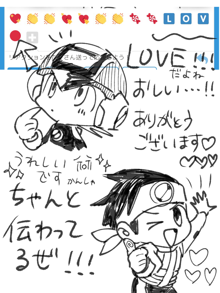 絵文字ありがとうございます!!!ほんとにうれしいこういうの😭うれしくて急いで描いちゃいました🙏いつも楽しい気持ちになってます☺️☺️☺️ありがとうございます!!!♡♡♡返信絵文字、ミスって変なの送っちゃったかもです……😭ミスったんだなと思ってください😭