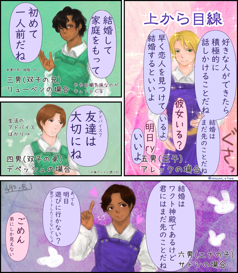 ちこり @chikori_wnl ♥︎ワーネバ(エルネアとプルト)✍︎オスキツ国3王子とフランコ国ナッシュ兄弟個人的解釈満載・カップリング要素の強いものなど初期国民のイメージを激しく損なう可能性がありますのでご注意ください。活動は男女のみ・公式カプも好きです。※スケブ依頼は受け付けておりません。プロフィール→https://potofu.me/chikori ☆quiet follow POIPOI 38