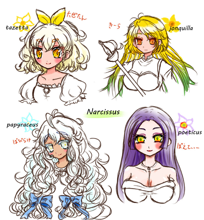 ハテソノ一次創作シリーズ。スイセンの精霊ちゃんたちです。左下のパピラケウスちゃんは以前の生き物描きメモにもまとめましたね。最推しスイセンなんですよ……行きやすい有名所では12月末~の新宿御苑がおすすめです。池のほとりに咲く真っ白な花畑はまさに楽園の花。