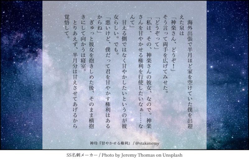 stakanemy☆quiet followREHABILI貴方は暁音の神玲で『甘やかせる権利』をお題にして140文字SSを書いてください。#shindanmakerhttps://shindanmaker.com/375517 合鍵持ってるか同棲してるかっていう感じの神玲ちゃん。この2人は恋人同士になっても苗字呼びだと萌える。 Tap to full screen (size:910x590).Repost is prohibited Let's send reactions! freqpopularsnackothersPayment processing Replies from the creator Follow creator you care about!☆quiet follow stakanemyREHABILI槙くんのマンションから花火見えるのでは!?と思って調べたら月島からだとそんなに大きくは見えないみたいでもそんなのお構いなしに槙玲ちゃんがベランダで花火の音を遠くに聴きながら冷えたビールで乾杯してたらいいなというツイートから生まれた stakanemyREHABILI貴方は暁音のカナ玲で『「癒しが欲しい」「俺とかどう?」』をお題にして140文字SSを書いてください。shindanmaker.com/587150 stakanemyREHABILI神玲を書きたい暁音さんは『はいはい、降参降参』をお題に、140字でSSを書いてください。shindanmaker.com/320966折角なのでハグの日ネタで。 stakanemyREHABILI暁音のカナ玲さんは「コレクション」をテーマに(しかしその語を使わずに)140字SSを書いてみましょうshindanmaker.com/430183 stakanemyREHABILI貴方は暁音の神玲で『最近可愛くなりまして、』をお題にして140文字SSを書いてください。shindanmaker.com/587150140は無理です(毎度)神玲←ちょっかい出す羽鳥さん的な感じのアレです stakanemyREHABILIカナ玲を書きたい暁音のお題「CDを借りる理由はね」shindanmaker.com/746677玲ちゃんに会うためにはまだ理由が必要なカナメくん、、 related works かほる(輝海)DONEシティーハンター冴羽獠×槇村香原作以上の関係かほるさんちの香で「生きる」と「地獄」のお話はどうでしょう? 5ツイート(700字)以下だと嬉しいですっ!#CHしたったー #shindanmakerhttps://shindanmaker.com/965157何か暗い感じになっちゃったけど、これで許して…(´・ω・`)この後は二人で天国へ行った(イッた?)に違いない(*´艸`*) 2 opinel432DONETSりんわかBLさんは『もしかして誘ってる?』をお題に、140字でSSを書いてください。#shindanmakerhttps://shindanmaker.com/320966 rick_underworldDONE貴方は🌹→☕️で『口説き落としてみせる、って』をお題にして140文字SSを書いてください。2022/12/13そう思っていたのに、#shindanmakerhttps://shindanmaker.com/587150 かほる(輝海)DONEシティーハンター冴羽獠×槇村香原作以上の関係書き手募集していたのでびんじょった(*´ω`*)Rさま(@ryu_wen)ありがとうございました!Rんちの冴羽くんと香で「唇」と「「ばぁか」」のお話はどうでしょう? 1ツイート(140字)程度だと嬉しいですっ!#CHしたったー #shindanmakerhttps://t.co/2IQJRYQwf0 SasameREHABILIあなたは細雪んちの獠香で【噛んで微笑ってもう一度キス / あれは嘘だった】をお題にして140字SSを書いてください。#shindanmakerhttps://t.co/FT9UR8u5Hs『血の証』を見た獠ちんからクレームがありまして「書き直せ!!」と言われちまったよ…(*꒦ິ꒳꒦ີ*)獠ちんが悪いんじゃん!! SasameREHABILIあなたは細雪んちの獠香で【噛んで微笑ってもう一度キス / あれは嘘だった】をお題にして140字SSを書いてください。#shindanmakerhttps://t.co/FT9UR8u5Hs過去最短で書いた気がする( *¯ ꒳¯*)フフン aosabikinakoTRAINING貴方はハル相で『最大級の口説き文句』をお題にして140文字SSを書いてください。#shindanmakerhttps://shindanmaker.com/375517 かほる(輝海)DONEシティーハンター冴羽獠×槇村香原作以上の関係あなたはかほるさんちの香ちゃんで【癖になるかも / 行儀の悪さは艶やかさ】をお題にして140字SSを書いてください。#shindanmakerhttps://shindanmaker.com/780366これはお行儀が悪い方が萌える(*´艸`*) こよみTRAININGこよみんちの獠と香で「バスタイム」と「モーニングキス」のお話はどうでしょう? 1ツイート(140字)以下だと嬉しいですっ!#CHしたったー #shindanmakerhttps://shindanmaker.com/965157ギャグ路線?😅お題の言葉は直接は使ってない😅直接表現はしてないので、全年齢。 recommended works 湯切@創作用DOODLE未来の話。今日の流華と美彩都疲れて帰ると相手が迎えてくれて甲斐甲斐しく世話を焼いてくれた。ハグするとストレスが三分の一になるらしいという話をしたら間髪をいれずに抱き締められた。あー、癒される。#今日の二人はなにしてるhttps://shindanmaker.com/831289…に1枚追加して再upしました。リアクション下すった方ありがとうございましたー! 2 SasameREHABILIこよみの獠と香で「ナイフ」と「新宿駅」のお話はどうでしょう? 1ツイート(140字)程度だと嬉しいですっ!#CHしたったー #shindanmakerhttps://t.co/pVfxz10Cptこよみさんのお題をお借りしました♥自分のお題?(*'ω'*)......ん? aosabikinakoTRAINING貴方は門司くんで『ずるい人』をお題にして140文字SSを書いてください。#shindanmakerhttps://shindanmaker.com/375517EP8以降くらいの門司くん独白 みみみTRAINING貴方は萌えが足りないと感じたら『欲しいものない?ってきかれてお前って答えちゃうディルアス』をかいてみましょう。幸せにしてあげてください。#shindanmakerhttps://shindanmaker.com/524738 2 selen_bkmnDONE貴方はクレカレで『長く一
