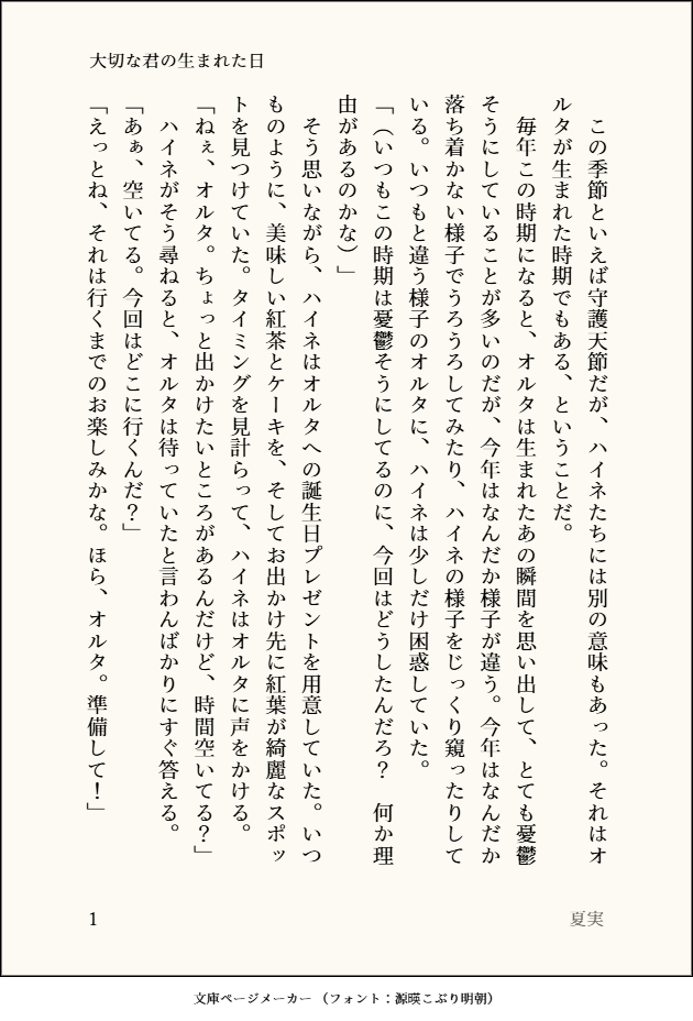 Heine_Alter919☆quiet followDONEオルタの成長に感動するハイネの話 show all(+3 images) Tap to full screen (size:630x928).Repost is prohibited Let's send reactions! freqpopularsnackothersPayment processing Replies from the creator Follow creator you care about!☆quiet follow Heine_Alter919DONEオルタの成長に感動するハイネの話 4 Heine_Alter919DONE守護天節を楽しむ人のために頑張るハイネとオルタの話 4 Heine_Alter919DONEレストラン「ビスマルク」で臨時のアルバイトをするハイネちゃんの話 4 Heine_Alter919DONEハイネの誕生日を祝うオルタの話 4 Heine_Alter919DONE新生祭に思いを語るハイネの話 4 Heine_Alter919DONE紅蓮祭を楽しむハイネとオルタの話 4 recommended works nekotamakororiDOODLE #エオルゼアのこ版深夜の創作60分一本勝負お題【武器】+60min遅刻参加お邪魔します。素敵なお題イラスト拝見して自分も描きたくなりました!占星術師の武器大好きです! nekotamakororiDOODLE #エオルゼアのこ版深夜の創作60分一本勝負お題「ロール:ヒーラー」+90min占星術師大好きなんですけど、ヒーラーと言えば白魔道士というイメージが強いです! nekotamakororiDOODLE #エオルゼアのこ版深夜の創作60分一本勝負お題「雨」+60min傘のアクションいいですよね、可愛いし nekotamakororiDOODLE #エオルゼアのこ版深夜の創作60分一本勝負【ハイドレインジャ(紫陽花)】 nekotamakororiDOODLE #エオルゼアのこ版深夜の創作60分一本勝負お題【犬】柴犬もふもふかわよいねぇ nekotamakororiDOODLE #エオルゼアのこ版深夜の創作60分一本勝負お題【エモート:暑がる】+60min持ってないので完全に想像です。アメノミハシラ待ってろよ…! nekotamakororiDOODLE #エオルゼアのこ版深夜の創作60分一本勝負お題【手を伸ばす】+60min目覚ましテーブルクロノメーターに みるくMOURNING🌟🎈将参派生パロとpkmnパロ時空2です。前に出したかった子達を出したい欲に負けました。何でもオッケーな方、推奨です。 4823 Nekomi_0DOODLE