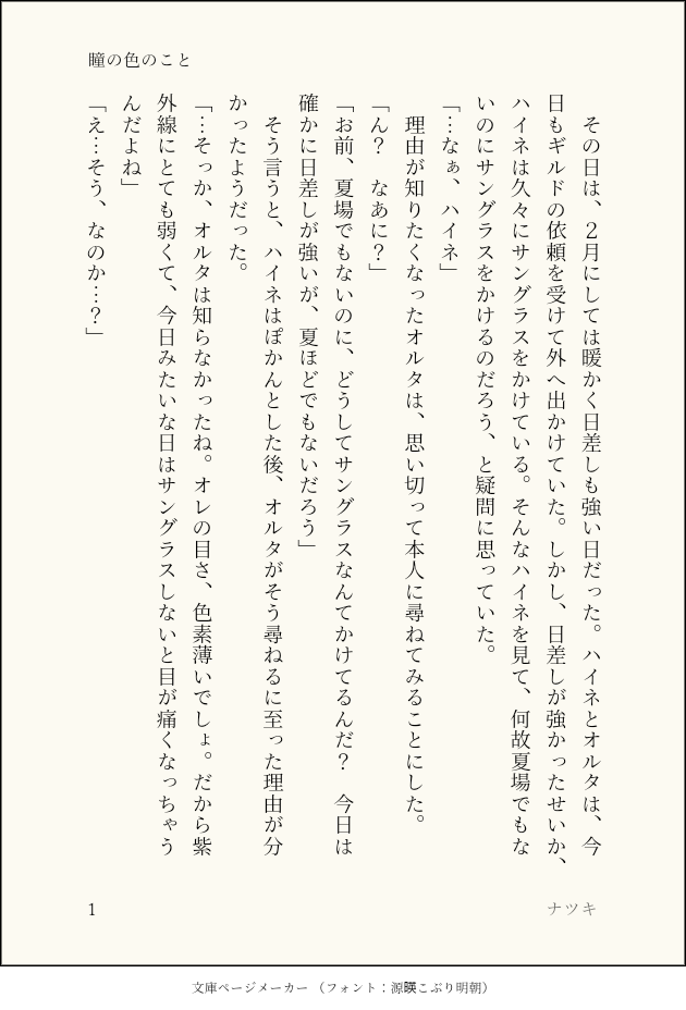 Heine_Alter919☆quiet followDONE瞳の色と眼鏡のこと show all(+3 images) Tap to full screen (size:630x928).Repost is prohibited Let's send reactions! freqpopularsnackothersPayment processing Replies from the creator Follow creator you care about!☆quiet follow Heine_Alter919DONEレストラン「ビスマルク」で臨時のアルバイトをするハイネちゃんの話 4 Heine_Alter919DONEハイネの誕生日を祝うオルタの話 4 Heine_Alter919DONE新生祭に思いを語るハイネの話 4 Heine_Alter919DONE紅蓮祭を楽しむハイネとオルタの話 4 Heine_Alter919DONEアイスを分け合うハイネとオルタの話 4 Heine_Alter919DONE七夕の行事を行うハイネとオルタの話 4 recommended works nekotamakororiDOODLE #エオルゼアのこ版深夜の創作60分一本勝負お題【武器】+60min遅刻参加お邪魔します。素敵なお題イラスト拝見して自分も描きたくなりました!占星術師の武器大好きです! nekotamakororiDOODLE #エオルゼアのこ版深夜の創作60分一本勝負お題「ロール:ヒーラー」+90min占星術師大好きなんですけど、ヒーラーと言えば白魔道士というイメージが強いです! nekotamakororiDOODLE #エオルゼアのこ版深夜の創作60分一本勝負お題「雨」+60min傘のアクションいいですよね、可愛いし nekotamakororiDOODLE #エオルゼアのこ版深夜の創作60分一本勝負【ハイドレインジャ(紫陽花)】 nekotamakororiDOODLE #エオルゼアのこ版深夜の創作60分一本勝負お題【犬】柴犬もふもふかわよいねぇ nekotamakororiDOODLE #エオルゼアのこ版深夜の創作60分一本勝負お題【エモート:暑がる】+60min持ってないので完全に想像です。アメノミハシラ待ってろよ…! nekotamakororiDOODLE #エオルゼアのこ版深夜の創作60分一本勝負お題【手を伸ばす】+60min目覚ましテーブルクロノメーターに Ruri_LOMUTPAST再録「レイトン教授シリーズ脇役(モブキャラ)アンソロジー」にて寄稿させて頂いた作品を、アンソロ主からの許可がありましたので掲載致します。奇跡の仮面のキャラに愛着がありすぎるが故に、最後のページに奇跡の仮面に登場する全てのモブ(ナゾガール&ボーイも含む)を描きました。今思い返しても狂気だと思います😇楽しんで貰えたら嬉しいです🙌 6 0nM3llowDOODLE🔫🔦 2