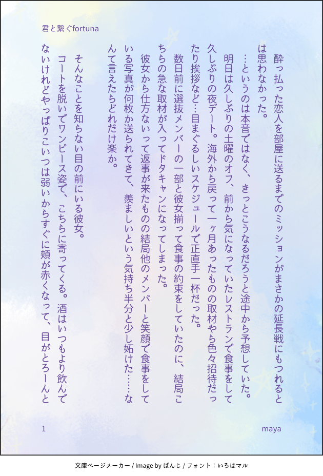 mayaringo2455☆quiet followMOURNINGホイッスル!水野竜也くん夢(未来)これも昔プロットだけ残してたやつ。 show all(+6 images) Tap to full screen (size:630x928).Repost is prohibited Let's send reactions! freqpopularsnackothersPayment processing Replies from the creator Follow creator you care about!☆quiet follow mayaringo2455PASTスタオケ朔唯。夏っぽーいネタ。結局キャラスト最後まで読んでないや…そろそろ読もうね…もうサ終から半年なの…早い🥲 4 mayaringo2455PASTアンジェリークルミナライズ。ジルアン。これ途中までしか文庫メーカーに作成してないから、微妙なとこで終わります。続きは…気が向いたらこっちに移動するかも(支部にはフルであげてる) 3 mayaringo2455PASTアンジェリークルミナライズ。ジルアン。ほんっっとにゲーム発売当初のはまり具合やばやばでしたね。めんどくさい男が好き🥺← 4 mayaringo2455PASTスタオケ刑唯。温泉イベントの時に浮かんだネタ。イベント前に創作したからどんな旅館に泊まるか分からなかったから、妄想で。 4 mayaringo2455PASTスタオケ朔唯。森の広場でほのぼの。 4 mayaringo2455PASTスタオケ。初期の頃の温泉イベントネタ。香坂先輩と仲良く温泉入る唯ちゃんな話☺️ 4 recommended works _tannbo_24DOODLEズブズブセフレ沼時代の獪善たぶん付き合ったらもう首締めとかやらんと思う nokibi_akiDONE頼もしい隣人。奥様初心者ですから。 4 thrills_tDOODLEI'm fvcking horny 4 komaki_etcDOODLE雨想。スタバのカスタム 1757 大福餅DOODLEボイバグの小話②。 1438 liliusuanDOODLE其实是无差的(谁好人画了咬还无差喜欢轩策就是轩策喜欢策轩就是策轩👉🏻👈🏻 いぬうさDOODLEクリスマスっぽいヤーツ乗算とか加算とか加減がいまいち巧くいかない 2 1341flammaeDONE刀ピークライシスト Sak_iDOODLEルフユ