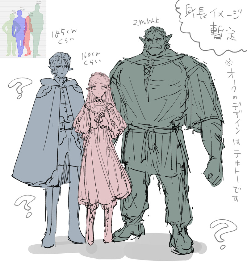 【創作】ザハル家族の身長イメージ(暫定)家族に囲まれてると小さいカーチャンだけど一応160cm以上はある(この世界のエルフは長身が多い) オークをどのくらいまでデカくしても平気♂なのか想像できないけどファンタジーだからすごくでかくでもいけるのかも…♂(?
