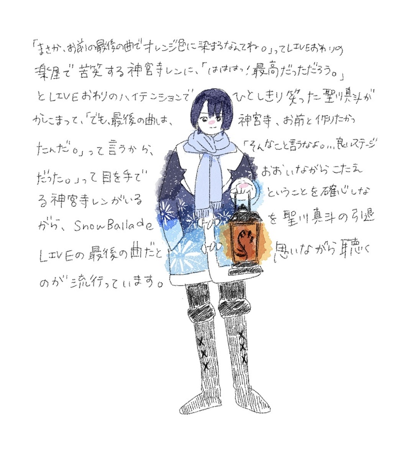 「まさか、お前の最後の曲が、オレンジ色に染まるなんてね。」ってライブ終わりの楽屋で苦笑する🧡に、「ははは!最高だっただろう。」とLIVE終わりのハイテンションでひとしきり笑った💙が、かしこまって「でも、最後の曲は、神宮寺、お前と作りたかったんだ」っていうから「そんなこと言うなよ。、、良い最後だった。」って顔を覆って言う🧡を想像しながら、💙の引退ライブの締めの曲としてスノバラを聴くのがマイブ