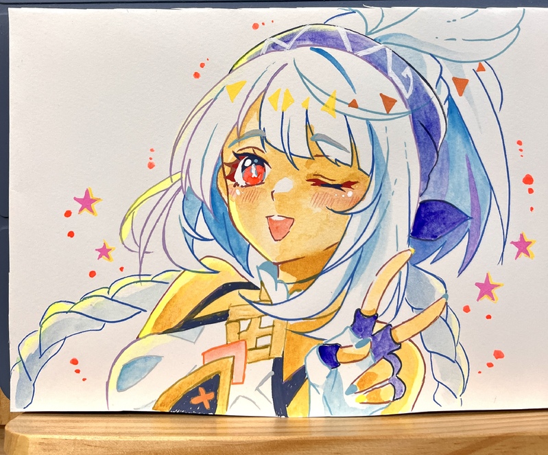 蛍光色の透明水彩とアクレアで試し描き!蛍光色カメラだと全くわからないんだけど、かなり発色良くて使って楽しい絵の具、キャラのハイライト、風景画の太陽光に使うと原画が映えると思う