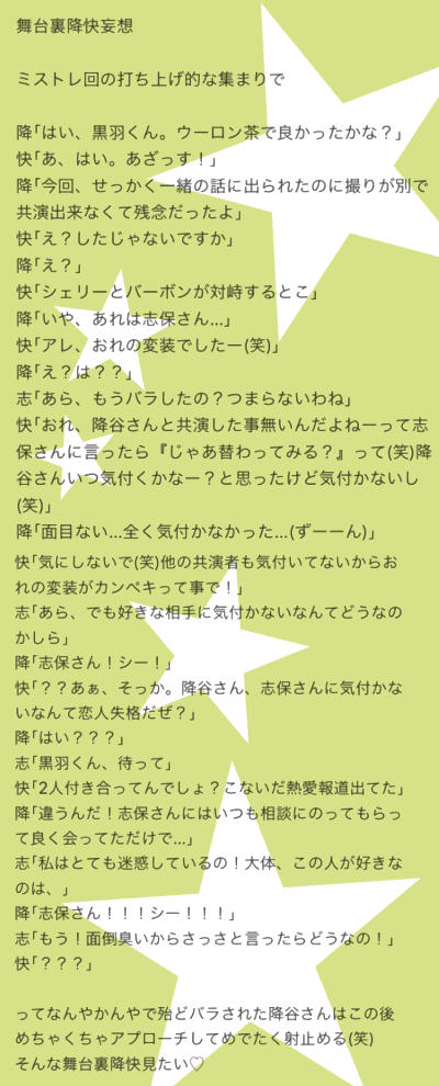 降快、舞台裏好きなんです♡志保さんは降さんの良き相談相手で、たまにイラっとした志保さんに強引に背中推されてるけど結果的に快くんとくっつけたので「志保さんありがとう」とフサエブランドのバッグとか贈ってますね(笑)
