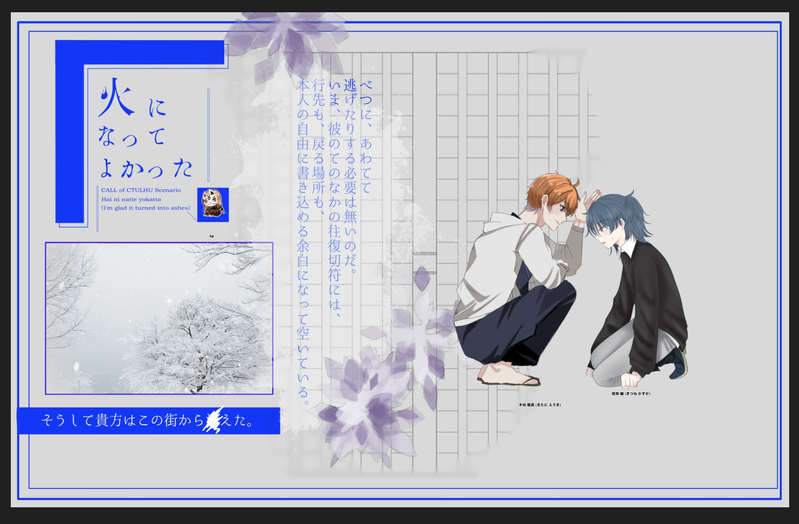 ume_meia16☆quiet followINFO『灰になってよかった』作:白河夜堂様KP:田中正義様KPC:木谷 楓真PL:うめPC:桔祢 幽両生還 Tap to full screen (size:1626x1067).Repost is prohibited Let's send reactions! freqpopularsnackothersPayment processing Replies from the creator Follow creator you care about!☆quiet follow ume_meia16INFO『あかり、ゆらゆら。もすこし、きみと。』作:岡園神話管理局様敬称略🔫断罪なる銃弾 継続KP:うめKPC:大上 藤夜PL:廿イチPC:加賀 旭END1 「ちゃーんと、旭の方が大事だし、旭が望むことしてあげたいって思ってるよ」 ume_meia16INFO『Good,night Judas. 』作:水族館直営お魚売場様KP:うめPC/PLHO1:創㮈宮 糖菓/はる様HO2:四十万 汐 /DANI様HO3:由良 唯羅々/パラ様HO4:染夜 聖月 /supiii様END-1 ume_meia16INFO『静なるテロリスタ』作:霧島ジャックKP:佐久らいろ様PC/PLHO1童子 芳野 静/うめHO2篤学者 鈴鳴 鹿乃子/はと様HO3美術家 Pupa/陽月様HO4異邦人 Gabriel・Barbaroza・Lima/おざ様全生還「本当は、いい子じゃないん、ですよ…」 ume_meia16INFO『愛罠蜂』作:臓器売買様KP:うめHO1オーナー 飴曲 太陽/うめHO2バイト 逆瀬川 燈/廿イチ様エンド愛 両生還「まぁなんだ…せめて食える量のケーキにしろよ」 ume_meia16INFO『ソープスクール』作:ねこずし卓KP:うめHO1:雨宮 静香先生/ハリー様HO2:香下 要月先生/えのき様HO3:加茂末 綾芽先生/Ringo様HO4:江野 莚先生/シラス様エンドB 全生還 ume_meia16INFO『静なるテロリスタ』作:霧島ジャック様HO童子 個別導入KP:佐久らいろ様PL:うめPC:芳野 静「こ、こんにちは、ぼく、芳野静といいます」 recommended works omiomi038DONE童磨×黒死牟R18無断転載禁止。Repost is prohibited. 禁止私自转载、加工Password↓Are you above 18 years old?【yes/no】 3 pirafu06SPOILERCoC「灰と甘露」→「偽りのカノープスより」‼️ネタバレあり‼️強めの幻覚含む。 10 ゆきだるま⛄INFOCoC / 孤立無援の星PLPCゆきだるま(セオ・クロフォード)「きっと、ね。」 morioka_trpgMEMOエモクロアTRPG「ヴェルネの天使は死を歌う」セーブ1日目!!!!少年たちずっとキャッキャしてて楽しい😌 specialsourlemonDOODLE ine_3hnDOODLEさらちゃんしーしー lalala_ray_888INFO* 1/12(日) SUPER RTS!! コピー本サンプル *・R18・表紙込み計8p・アカッシケジがふたなり(両性具有)です。・一見♂ですが下半身に♀もあります。・最初からおっぱじまてる上に全ページエッヂしかしてません!pass:18↑?y/n 7 麻辣香锅刃DOODLE卖屁股 33 tsurara100MEMO個人的な月鶴イメソン『Grenade』(https://www.youtube.com/watch?v=SR6iYWJxHqs)を月鶴風に訳してみた。あまりにも月→鶴への独白(兼言い掛かり)に仕上がったのでところどころ注釈を入れました…! 555
