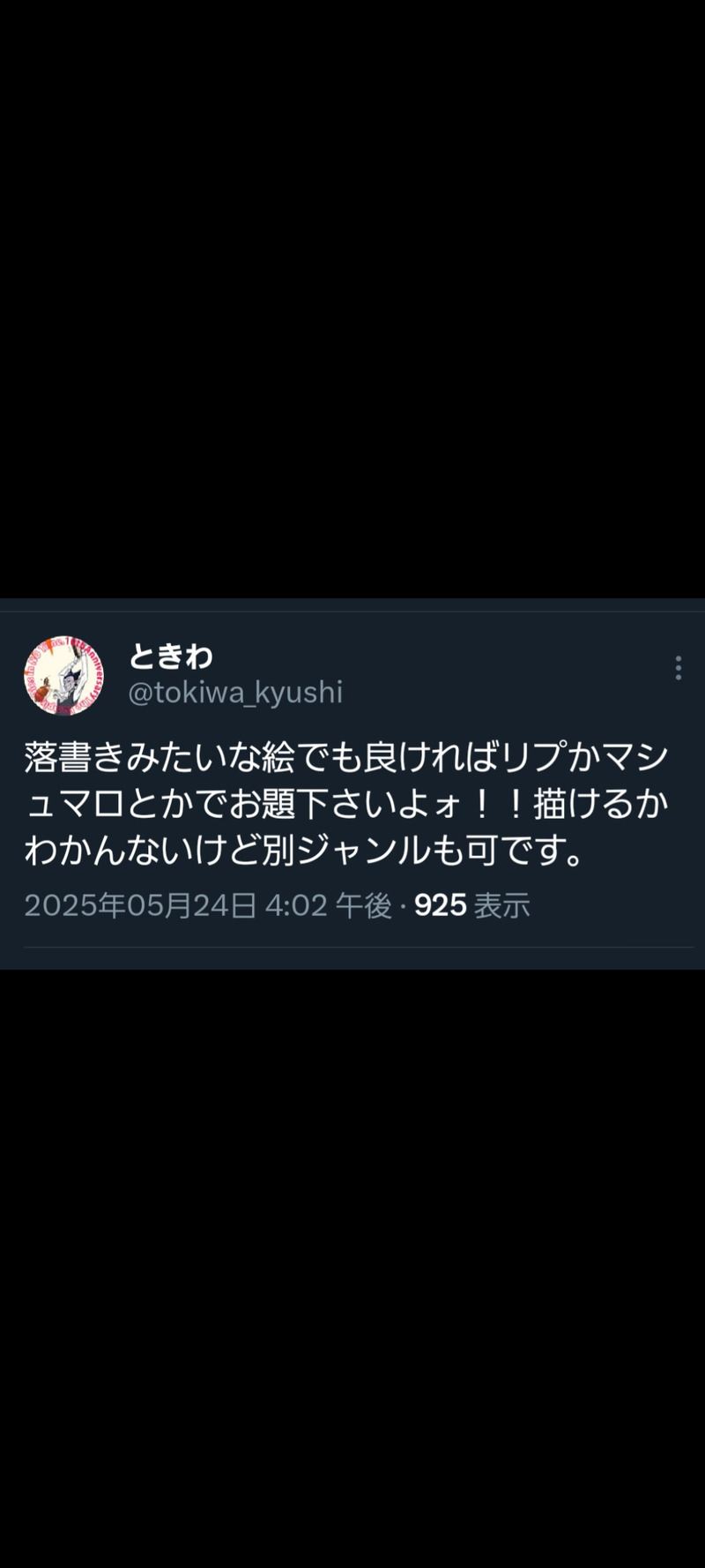 tokiwa_kyushi☆quiet followDONE今年の春にせびらせていただいたお題をまとめです。限界原稿中に始めて、ものによっては数ヶ月お待たせしてしまったものもあってほんとに……ほんとにその節はお待たせして申し訳ありませんでした…………。楽しませていただきました。お付き合い下さりありがとうございました! show all(+8 images) Tap to full screen (size:1080x2400).Repost is prohibited Let's send reactions! freqpopularsnackothersPayment processing Replies from the creator Follow creator you care about!☆quiet follow tokiwa_kyushiDONE今年の春にせびらせていただいたお題をまとめです。限界原稿中に始めて、ものによっては数ヶ月お待たせしてしまったものもあってほんとに……ほんとにその節はお待たせして申し訳ありませんでした…………。楽しませていただきました。お付き合い下さりありがとうございました! 9 tokiwa_kyushiDONE5月に出した冊子「QED」をオフ本にした際に追加したページです。ロナドラです。 8 tokiwa_kyushiDONE本当は12月1日のフェスで無配になるはずだった漫画。「愛してるぜ吸血鬼!!」の本のおまけです。本読んでないと訳分からんやつだよyes? 3 tokiwa_kyushiDOODLE私は人間「ギャグ漫画でシリアス考えるの大好き」!!!Δロドだけど大丈夫ですかYes/No 2 tokiwa_kyushiDOODLEメイドの日の裏側おしりがチラリしてるので一応。pass:おしりは好きですか?(yes/no) 2 tokiwa_kyushiINFO先日10/15に発行したロド本を再販します。致命的なミス(A5原稿データをB5で印刷したおバカ)とか、細々したミス修正とページ追加しました。の、追加ページを会場で買って下さった方向けに公開します。 3 recommended works mizuki_410DONE本編ロナドラとΔロナドラが出会うお話。ツイッターでボソッと呟いたネタから生まれました。 10114 mizuki_410DONE読切一同 _baisenDONEソファと棺桶6にて公開させていただいてるネップリのイラスト及び印刷番号となります*ローソン&ファミマとセブンイレブンで印刷期間が異なります、ご注意ください*プリントはマリンと派生が一緒のものだけ2L判で後の物はL判でお願いいたします*フチなしでの印刷可能 5 tyouseityumi33TRAINING嘘ロド+本ド 9 ikeifuuna94DOODLE1個前の30年後ドちゃベビドの差分です。マッパなだけです。成人済?(yes/no) ちゅうDONE台風の日のロナルドくん。収納し忘れていたので今さらながら収納! 5 shinoPAST※過去モブドラ設定有りのロナドラドラちゃん右側オンリー『世界で一番drdrちゃんⅢ』開催記念で以前無配してモブドラ+ロナドラの小ネタを再掲します※ドラちゃんがビッチです(過去)※下ネタギャグです 6 fjd_94PAST「ロナドラ版深夜の創作一本勝負」20221217開催、第六回お題【愛と食卓】【元気になあれ】より。 4 Hilo0309PROGRESSチョコ食べるとしょっぱいもの食べたくなるよねっていうヤツであっちもこっちも描きたくなる性なので同時進行で描いてます原作軸の方は過去作のリメイクバイクとか銃とか出てくる全年齢のあっさりロナドラパロの方は多数リクエストを頂いていた魔法学校大会編甘い2人の学パロロナドラ赤字でお察し下さい笑ページ数は変動しますが恐らくこのくらい月末までには公開します(尻叩き 2