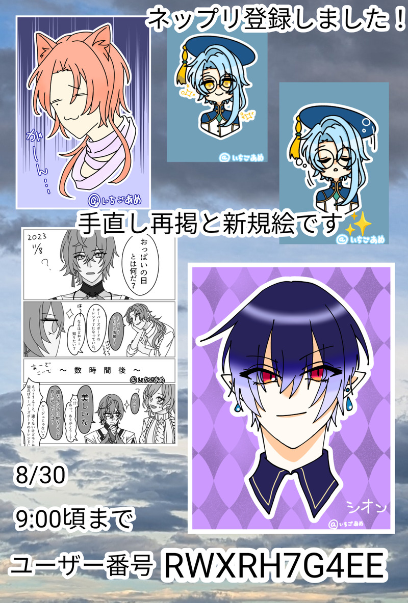 いちごあめ☆quiet followINFOゆめくろネップリ登録しました〜!8/30日までですので気になった方是非よろしくお願いします✨枠ありがオススメです☺️✨ #ゆめくろ dreamyFuture #ネップリ Webprint Tap to full screen (size:1181x1748).Repost is prohibited Let's send reactions! freqpopularsnackothersPayment processing Replies from the creator Follow creator you care about!☆quiet follow いちごあめDONEユヒル→🎀ドロシー→🧙♂️ノイル→🍳カイゼ→👑の突然思いついたネタです。ドロユヒ前提。ハッピーエンドその後のドロシー√をサラッと触れるのでネタバレ避けたい方はバックで!※ユヒルちゃんは虫が平気でドロシーは虫が得意な方ではないという勝手なイメージです。出演メンバー、ユヒル、ドロシー、カイゼ、ノイル 687 いちごあめDONE迷子になっちゃったドロシーとユヒルちゃん。その後無事何とかなりました。ポイピクのみ(pixivも)掲載おまけつき 2 いちごあめDOODLE堀川くんに2年ぶりにメイド服を着せました。堀川「慣れました」 いちごあめDONE春草さんお誕生日おめでとうございます〜!!!!今回のイラストは森邸組と画家組を描きたくて4人組み合わせしたいなと思っていたところに、このトレス素材を見つけたのでお借りしました!個人的に4人描くのは初めてだったのでたのしかったです!!!春草さんお誕生日おめでとうございます!!!!!Switchでもよろしくお願いします!!!!!!!!! 3 いちごあめDONEこのふたりの絡みを描きたかっただけなのに全力でネタに走りました。肌の塗り方は超適当です。すっぽーん 3 いちごあめSPOILERゆめくろ舞台の感想です。ほぼイツキです。語り合いたいです……!!!!もう最高すぎて……😭✨✨✨今朝Blu-ray予約しました✨ 3 related works ヒノ(ロクミハシコ)INFOアップルグミ感謝祭2で無料配布したネップリです。セブンは8/6、ローソン・ファミマは8/13までです。お時間のある時にぜひ! 2 十雲 暁(トグモ アキラ)DONE此方の絵も関係性自論3様でネップリ行います♪(*‘ω‘ ≡ ‘ω‘*)♪ かほる(輝海)INFO平成最後にネップリ折本出します。A6サイズ8ページ。R18小説を二本収録。そのうち一つは、ここで公開済みの「路地でもっこりする二人の話」です。コードは29日の夜遅く(30日に日付が変わる頃)に支部で公開します。サンプルで1ページだけチラ見せ。よろしくお願いいたします。 えっ⁉️INFOセブンネップリに一枚登録しました。セブンにて3月5日23時59分まで。L版サイズです。印刷とは少し色味が変わると思いますがご了承ください!!(上と下の飾りのフレームは付きません!!)(二枚目参照)良ければお願いします!! 2 harukita3MENUねっぷり!!!!!お品書き(?)L版で!!!! 5 m_aki824INFOパスワード→漣蒼士3巻収録[戯一誕生日4桁]コミックスをお手にとっていただきありがとうございます!ネップリもコミックスもお楽しみいただけたら嬉しいです♡ rrrccclll10DONEポーネのハートベリーカップケーキ生地もクリームもピンクのストロベリー味!ミルクアイシングにハートのトッピングシュガー♡ 2 糊口(ここう)MOURNING企画★https://twitter.com/4529man/status/1168059507101978624?s=19・構図ネタ出し(逆にしてよかった)・工程の記録・キャラ練習(焼我砲)珍しくデジタルで塗りましたがノーマルカラー(アナログ)ものちほど公開したいです。ネタの方が顔も勢いもよかったような💦線画ぬり絵にしよかなw(楽しくなさそう) 9 rrrccclll10DONEシャスラのクリスタルワインゼリー宝石のようにクラッシュして、マスカットを閉じ込めた白ワインのゼリー。三首海竜のウィングをイメージした琥珀糖を散りばめました。 2 recommended works あち(aichi_34)DOODLE原神のファンアート 12 マサキ=ナナヤDONE私服北斗 さつきMAIKINGそのうち描き終えたいタルタリヤ。 rvl7hyDOODLE原神の胡桃ちゃんです♡「見る目あるー⤴︎⤴︎♪」が大好きなのでそのイメージで♪(*^^*)アマネちゃんリクエストありがとうー!! そう3DOODLE原神の魈くんシャイニキのマーキュリー*******マーキュリー森川智之だし顔がよすぎて好きなんだけどウェディング終わってから始めたから泣いた。アリーナのマーは取りたい 2 さばちゃDONE厚塗り練習中… halDONE原神マフィア化 6 綺季(とうこ)DONE7/17 空中遊鯨 様にて展示してました!鍾タル、イイネ…😚 納豆キノコDOODLE【原神/ナヒーダ】魔神任務がめちゃくちゃ尊いすぎて、泣きながらプレイしてました。