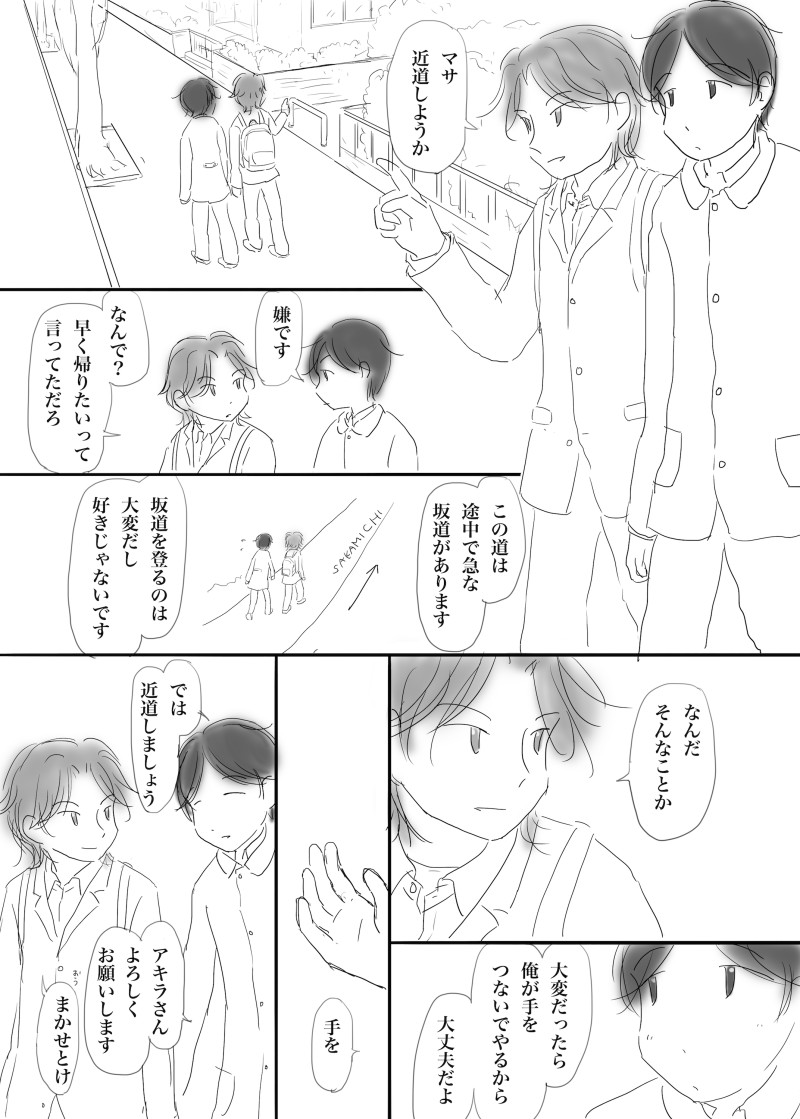 ななめ☆quiet followDONEワンドロに参加したもの。ワンドロといいつつ30分オーバーしました。お題「近道」。アキラ(世話焼き年下)×マサ(どんくさい年上)#創作BLワンライ・ワンドロ!(2020.3.23ワンドロ参加) #創作BL Original Bl #アキラとマサ akiraAndMasa ##アキラとマサ Tap to full screen (size:2144x3000).Repost is prohibited Let's send reactions! freqpopularsnackothersPayment processing Replies from the creator Follow creator you care about!☆quiet follow ななめDONEローズフェスティバルで展示していた『アキラとマサ』の漫画です。散歩中に見つけた野バラに手を伸ばすと……。4枚目の画像は、キャラ紹介もかねて最後のページに載せていたものです。 4 ななめDONE創作BL webイベントの無配DLペーパーに載せた漫画。 ななめDONE言紡弐で展示していたお話です。800字小説……といいつつ、ちょっとオーバーしてました。800字に納めるの難しい!カプなし・ほのぼのです。 848 ななめDOODLE言紡弐カウントダウン絵まとめ。描くの楽しかった! 7 ななめArtSummary2022テンプレお借りしました。 ななめReuse Christmasクリスマスツリーを準備する二人。 4 related works ななめDOODLEいちごの日。マサはいちご大好きです。たくさん食べさせてあげたい(アキラが)。 ななめValentine一昨年のと去年の。とてもピンク。この二人は今年のバレンタインもいつも通り仲良くしています(描けませんでしたが)。 2 ななめDONEマサの言動にあたふたするアキラ。マサはどちらかというとカサカサよりもベタベタしている方が苦手です。 ななめDOODLE平成最後の落描き。きっと令和になってもずっと仲良し。 ななめDONEポッキープリッツの日。マサはなんでアキラがポッキーを買ってきたのか知らない。アキラが買ってきたのはいちごポッキーです。 ななめDOODLE一次創作BL版深夜の真剣120分一本勝負お題「長距離恋愛」一緒に長距離歩いてきたような気がしてたけど、まだほんのちょっぴりだし、これから先の方が長いよね、っていう話。 ななめValentine一昨年のと去年の。とてもピンク。この二人は今年のバレンタインもいつも通り仲良くしています(描けませんでしたが)。 2 ななめDOODLE気晴らしにささっと落描き 2 ななめDONE過保護なアキラによって、もこもこにされるマサ。 recommended works 千三百一DONEメモマメイカ(37)「フクキョウコウサイ」https://raiot.net/i/1562749208140 かちいろDONE出来た~ツイのほうは影修正 yuinakdmtDOODLE創作BLくんのさっきのつづきてきな??やつ。目的は大きさ試し~~スマホで見てちょうどいい大きさを模索…小さめにしたけどどうかな… tabaDOODLE chinequoPASTフォロワーにささげた 乱八としめすな 2 勇の字DONEそれゆけド天然❗️勃起男と無頓着~付き合いたてのバカップル~[4コマ漫画]↑続きです(45)うそ返し********ハイヒール男子👠三部作その②(響は歩いてほしかった👠)#創作BL#勃起男と無頓着#漫画が読めるハッシュタグ#ハイヒール男子 yorukami_oekakiDOODLEドール垢の方でもコッソリ上げてたけどアイコンにした一次創作キャラです。本当はちゃんと色塗ったりしてからアイコンにするべきだったんだろうけどそんな余裕はなかった( ˘ω˘ ) 鬼束仁(オニ)DONEオリキャラ白鬼、朱瑠、桃元 ranchu000DOODLE「ん」って服をひっぱって誘う鳥たちはきっとかわいい