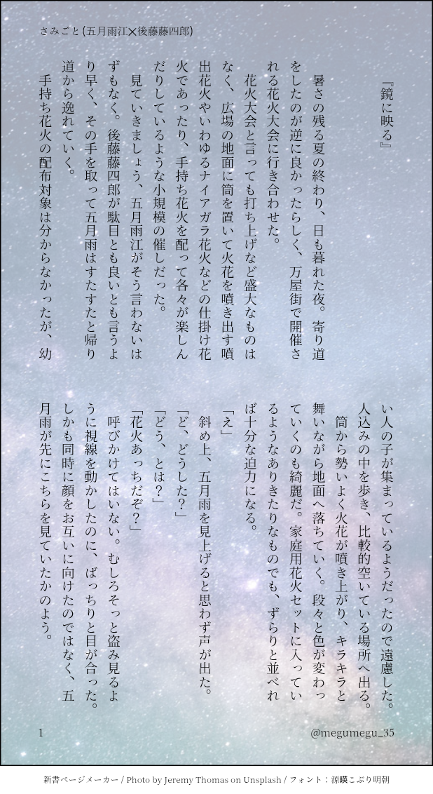megumegu_35☆quiet followDONEさみごと。喜んでくれたら嬉しい話。尾張へ贈られた記念の日、おめでとう!内容は記念日に絡む話ではありませんが、祝う気持ちは込めました。 #刀剣乱腐 swordCorruption #さみごと complaint show all(+3 images) Tap to full screen (size:618x1132).Repost is prohibited Let's send reactions! freqpopularsnackothersPayment processing Replies from the creator Follow creator you care about!☆quiet follow megumegu_35DONEさみごと。喜んでくれたら嬉しい話。尾張へ贈られた記念の日、おめでとう!内容は記念日に絡む話ではありませんが、祝う気持ちは込めました。 4 megumegu_35DONEさみごと小話!眠れない話。 2 megumegu_35DONEこてとごとのファーストコンタクトのお話。篭手切、ブライダルコンビ(後藤+五月雨)。全10p弊本丸の後藤は江たちとめちゃ仲良しなんですが、そのきっかけのお話。吉光の数とかは篭手の実装当時のものです。 10 megumegu_35DONEさみごと。君がいる景色の話。 3 megumegu_35DONEさみごと。いつだって会いたい。 5 megumegu_35DONEさみごと小話!呼び方の話。五月雨、髭切、桑名のとある一幕。後藤は不在です。 3 related works みざさぎ@特訓モードTIREDそのうちちゃんと色塗りたいばへし数日前に描いたやつ みざさぎ@特訓モードDOODLEばへし国広は長谷部が元気ないときは大抵主不足だと知ってて、審神者にも「長谷部は自分からあまり言わないから気づいたら教えて」と言われてるので長谷部のメンタルチェックに余念がないのですが、この場合は長谷部が恋煩いをしてるため全く見当違いの対処をしようとしている様子です(長い 明星(あきら)DOODLE⚠️女体化股間蹴りあげ!!!!!!!!(一応くにちょぎ♀未満) 2 みざさぎ@特訓モードPROGRESSばへし原稿〜したがき 李阿(miaco)PROGRESS一応にゃんちょぎ的なサムシング みざさぎ@特訓モードDOODLE少しすけべなのでワンクッション テンプレお借りしました〜! hyuga_kai31PROGRESS年賀絵の進捗ぽいぽい。終わらねぇ…… ☆Anna-M★DONE杵受け槍3P本の表紙...95%完成。・*・:≡( ε:)裏表紙がイマイチ寂しいので、中身(漫画)を描きながら考えます( ˇωˇ )✨相変わらずセンスねぇなぁ... tehomsubDONEBL くわぶぜ R18注意漫画 いちゃついてるだけです 2 recommended works hyuga_kai31TMP-SAVE #刀剣乱腐髭膝ワンドロ『柵』のラフ。これは珍しくラフ描いて下絵描いた 2 clover__zeroDOODLE[Touken Ranbu]10 November 2018 2 こよみPASTおでんかわいいよね 2 siroko005PASTみ・か・つ・る!! ② 2 けいすけMOURNING腐まで行くかは微妙ですが、アイドル的人気の乱くんが彼氏とお泊まりツイが炎上するとかいう自分でも頭どうしたの?という落書きです。1枚目は裏アカ流出(使用されたと思われるゴムの袋)、2枚目は本垢だけどつめが甘く(吸ってないはずなのにタバコ、眼帯等)…みたいなノリです。燭乱星人なので彼氏は燭台切さんです。 2 謎々九音DOODLEパッパは偶に壊れる。 kanikankanikamaDONE水麿詰め合わせ(1~4枚目猫耳兎耳、5~8枚目女装です) 8 灯野くずはPROGRESS次の本の表紙案と進捗 2 ぷるにゃDONE※ひざまる⚠︎注意⚠︎ 人魚化 触手腐向けそしてエビフライアイコンの呪い 8
