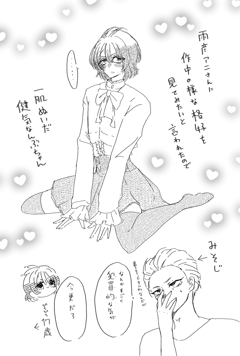 🐰ももみこ🐯☆quiet followDONE【雨玄】前に描いた百合ドラマ撮影中の雨玄んぶちゃんが憑依型タイプと聞いてエッ…な時に役が降ってくる事もあるのではと思って……にしても乙女過ぎたな。反省えっちなの描けない人間だからお目汚し申し訳ないです… #雨玄 yuXuan #女装 crossdress #R15 show all(+3 images) Tap to full screen (size:1620x2400).Repost is prohibited 🐰ももみこ🐯PROGRESSレオ&タイガWebオンリー「小指から伝えるテレパシー」にて展示する小説のサンプルです。レオくんのお誕生日にタイガくんががんばるお話です。レオくんお誕生日おめでとう🎉🎉🎉 4066 🐰ももみこ🐯DONE【雨玄】前に描いた百合ドラマ撮影中の雨玄んぶちゃんが憑依型タイプと聞いてエッ…な時に役が降ってくる事もあるのではと思って……にしても乙女過ぎたな。反省えっちなの描けない人間だからお目汚し申し訳ないです… 4 🐰ももみこ🐯DONE※オリジナルドラマ注意※キャラ崩壊注意※境界?注意昨日描いたんぶちゃん主演の俺得ドラマの続き最終回の最後のシーンで2人がかわいい格好でデートしてたらいいな…って思って…そう、これは百合ドラマです。 2 🐰ももみこ🐯MOURNING※キャラ崩壊※境界?ありんぶちゃんにこういうドラマでこういう役やって欲しいな…っていう俺得でしかないドラマ設定①初手キービジュイメージ②作中設定と描きたいやつ③10話くらいのクライマックスのシーン。放送終了後SNSのトレンド1位になったとか 3 🐰ももみこ🐯DOODLE神速とLegendersに火/花/アディ/クション歌ってほし過ぎて神速に火/花/アディ/クションの衣装着てもらった折角なので髪型もそれっぽく寄せてくれ 🐰ももみこ🐯DOODLE【劇中劇】ジーンくんは実は人魚だったらいいな……って妄想ザック船長の漢気に惚れて片目と引き換えに人間に擬態する能力を手にしてフェニックス号のサブしてるっていう妄想その2です related works roki_murasameDOODLE太陽テレビってサンテレビよな おにぎりたろうTIRED【腐向け&擬人化+微小な百合】年末年始にギチギチに予定詰まりすぎてカッとなった結果、蛆虫が湧いたような変態クソラクガキを描き殴りストレス発散をしてたんだぜww(いつも通り) #R18 #擬人化 #腐向け #女装 #百合 8 きよし@キバ&ウィザード履修中MOURNINGスーパービックリマン ティキ(女装)メイク変にしてギャグで笑いを取ろうとしても、元の顔の良さは消せないと言う事実を突きつけてきた回。 蟹エリPASTイクラまとめ。っていうかクラウチさんのまとめですね…… 49 Bは雑食すぎて大変DOODLE男子メイドって楽しそうなこと言ってたからつい。女装だぞ気をつけろ 長門菊花PAST女装ネタなのでワンクッションしています。スパロボCCの強化パーツネタ。普通に強いパーツなので複数付けていました。 2 おにぎりたろうDOODLE女装コスプレイヤーたちの溜まり場(仮)#女装 #腐向け 6 shiro53giDOODLE創作男子……の女装。もう少し男って分かるようにしたかった。 2 ゆけじまDOODLEセーラー服奥野細道 recommended works starareorangedrDOODLEウインクの日によせて #神速一魂 みのるDOODLEツインテの日にあやかりたかったけど無理でした sanmiDONEおフィンのお衣装とお手て繋いでるのはちゃめちゃにかわいいのでグリフィンドールに315億点 __yuo_DONE玄武おめでとうでしたこれからもずっと幸せを願ってる __yuo_DONE実装やった〜☺️特にこのへんが好きなので見てほしい〜!ガシャは… 2 9ri_snmnDONE久しぶりにがっつりお絵かきした!いっぱいハートくれ! 季山桃子PROGRESS金魚に落ち着いた sheep_hituziTRAINING 2 xun_yingTIRED楽歌ちゃん
