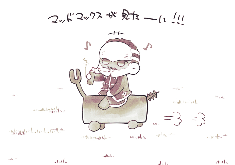 そして1ページでは置けるものも何もないので、適当にもほどがある記憶で描いたデスロードの落書き。中尉殿が口に噴射しているのは生クリームスプレー。