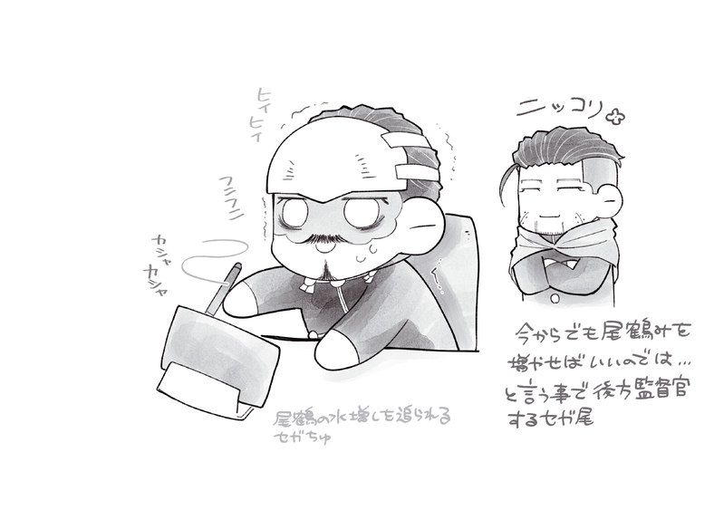 置ききれなかった分の残りと、ついでにドラマ放送時に描いていた感想のような何かの絵。残り分だけだと枚数が少なかったので…。どうせならこの前出した本の時に描いた分も入れてしまって良かったかもですが、それは流石に「いやついこの前見た絵だが~~~!」となるような気もしてとどまりました。そもそもまとめて一気に見るような絵ではないのですが!そしてこれだけ描いても安定しないセ…中尉殿のバランスである…。