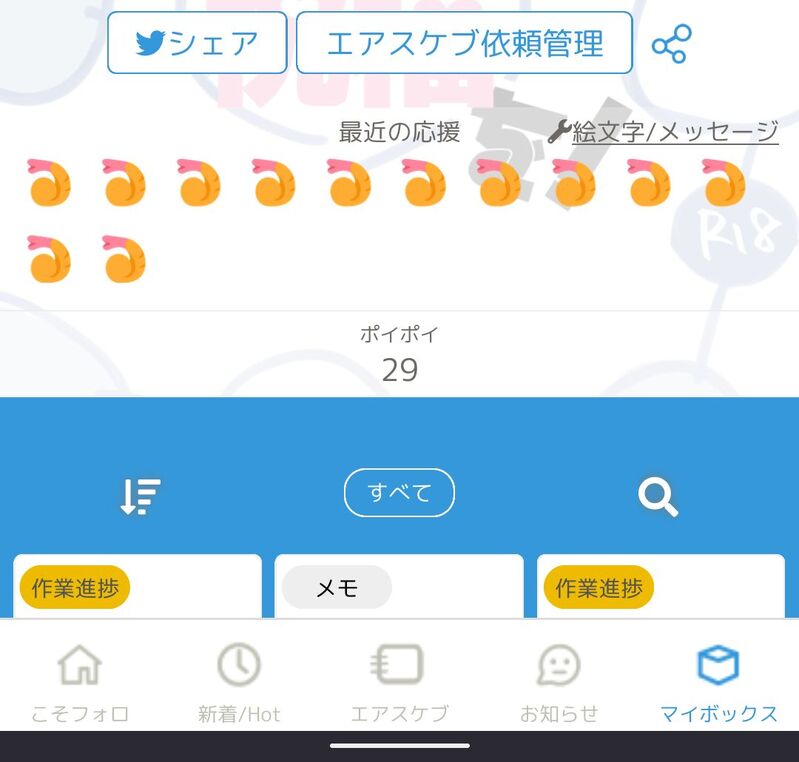 ポイピクはログインするとこれまで頂けた応援絵文字(メインキャプションのところにあるやつ)が並ぶようになっており、今の私のマイページには心優しき方のお陰で添付のようにエビフライがめちゃくちゃ沢山並んでいるので、進捗を植えに来る度にニコォ…😊となっています。このような怪しい場所へ本当にありがとうございます!!