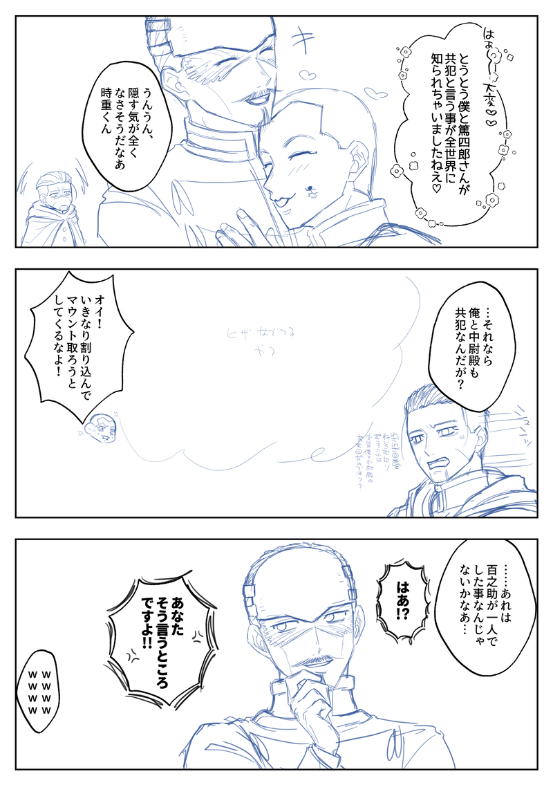 喧嘩するほど仲が良いように見せかけて割と普通に仲の悪い上等兵ズが、中尉殿を取り合ってマウントを取り合う世界線は良いよね~~の気持ちで描こうとしたものの、それが動機のはずなのに全くギスらせられる台詞が考えられない平和脳(??)なのと「そもそもコレ面白いの…?」の正気に返ってしまったのとで完成しない可能性が高くなったので、中途半端かつ汚い下書きの段階でここに不法投棄しておきます…消すのは悔しい貧乏性!