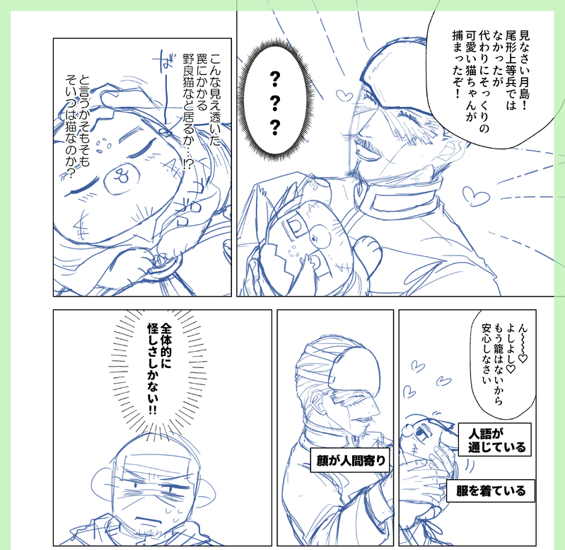 下書き半ページ完成。と言っても最後の軍曹殿は完全に力尽きているので、そこは下書きではなくラフ以下の何かです!!