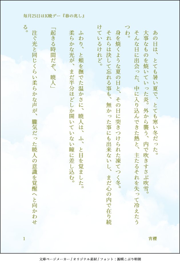 yoizakura44☆quiet followDONEお題『春の兆し』初参加です。KK生存IF。2人の出会いが春の訪れであれば良いなという願望を込めて。 #毎月25日はK暁デー #K暁 show all(+1 images) Tap to full screen (size:630x928).Repost is prohibited Let's send reactions! freqpopularsnackothersPayment processing Replies from the creator Follow creator you care about!☆quiet follow yoizakura44DONEK暁デー久しぶりの参加です。お題『汗』Kおじが少しむっつりかもしれません。 2605 yoizakura44DONEK暁デーのお題『花束』。遅刻ですが参加させて頂きました。素敵な企画をありがとうございました💐 4125 yoizakura44DONEお題『春の兆し』初参加です。KK生存IF。2人の出会いが春の訪れであれば良いなという願望を込めて。 2 yoizakura44TRAININGK暁習作、ポイピク投稿テスト。最初は本編軸で。別れと再会の、我が儘と約束。 related works 085TRAINING #毎月25日はK暁デー より『ジューンブライド』 6 _hinon_CAN’T MAKEKKおじさんの匂いに酔っぱらう猫暁人くんのお話(猫パロ)K暁 337 時人歩DONEこのCPで書くのは初めてなので初投稿です。こんな処女作で大丈夫か。まだゲーム完走してないんですけど、これはここ逃がすと一年後になってしまうのでフライングで失礼します……!K暁です・3・ 2124 吉冬⛩DONE #毎月25日はK暁デーお題:彼岸花、徒競走けけおじの色んな面が好きなあきとくんの話。名有りのモブ依頼人が登場します。 7 32honeymoonMOURNING・マンネリ防止のために少しだけ変わり種。K暁。痩男が名前だけ登場します・二心同体軸ですがご都合主義でKKが体を得てます・ゲーム内時間で言うと5章の終わりくらいの時間軸・暁→K、K→暁の両片想い、とみせかけた完全両想い・最初やや無理強い表現はありますが基本的には愛し合ってます!最後中出し表現あります苦手な方はご無理なさらずそっ閉じで。PASS→20歳以上ですか?英語3文字でどうぞ。 7478 鯖目ノスDONEゴスハンK暁小説エピローグ編です長々とお付き合いありがとうございました。これにて完結です。K暁といいつつもおじさんのクソデカ感情が露呈しただけですが将来的にK暁になる予定だからオッケー(?) 9522 アカリMEMOアップしたK暁(🦊)の小ネタと🦊暁くんの絵です。 2 ウジムシ蛾DONEちょっと書いたのでのせてみます。K暁。 3704 na2me84DOODLE140文字がたまったので纏めました。 21 recommended works kg4awt108DONEマシュマロのリクりくで頂いた、痩男→暁人←KKの小説です!普段K暁しか書かないので書いててとても楽しかったです🎶 1737 ねこまんまMOURNINGマレビトのコアに関する小さな妄想(昔々の再放送ちょっとだけ追記) 557 みらいDONEキスの日には遅れてしまいましたが!K暁です。世界観はいつもの通りです! 1021 takeke_919DONE #毎月25日はK暁デー素敵タグにギリギリ間に合いました💦お題は「おはよう」Kは成仏したのではなく、暁の中で眠りに付いたという説を添えて。毛色の違う話が書きたいなぁと思い至ったまでは良いものの、毎度のことながらお題に添えているかは迷走してます🤣 5216 ねこまんまMOURNINGおはよう、まであと少しだけ。なんとか今日中に続きを追加できました。微粒子のレベルでセンシティブ。#毎月25日はK暁デー 2 Otomiya9876DONE2024年元旦あけましておめでとうございます!バディが好きなもめんちゃんが辰になって(つもり)飛ぶ!!(しかし2人分の体重は重かった) nachi_osoraREHABILI今日の短いK暁まとめ その7だいたい140字ぐらいのSS。最近は天元突破しがちで200字ぐらいあるのもありますが、メーカーで一枚におさまったものはこちらに入れてます。(特に今回は最後のが長いw)今回も7日分です。 7 vr2022_editDOODLEお前は…最高の相棒だ retrofuture_08DONEミック編より前のクリスマスのイメージ 2