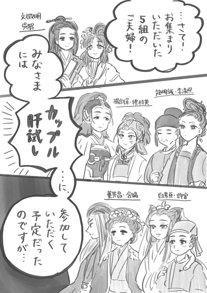konno☆quiet followDOODLE特別町風景「百鬼夜行」楽しみだな〜!!!🧟♂️✨✨の気持ちで描いたカップル肝試し(の前座)漫画です #水都百景録 suiduHundredViews show all(+2 images) Tap to full screen (size:2039x2894).Repost is prohibited Let's send reactions! freqpopularsnackothersPayment processing Replies from the creator Follow creator you care about!☆quiet follow konnoDOODLE【シリーズ漫画】桂英が猫になってしまった!①〜④まとめ(未完)①2p+おまけ1p②4p③3p④3p(25/1/4最新)最初は単発だったけど、なんか気に入ってしまいちまちま続きを描いてるシリーズです 13 konnoDOODLE【漫画】その双肩に担うもの辺境任務が長く江南水都アウェーの宗保さんを飲み会に呼んでくれる藍玉将軍っていいよな(妄想)※本編3p、おまけ1p、カラーらくがき1枚 5 konnoDOODLE【漫画】BL占いBL用語は登場しますがBLカップルは登場しませんなんでも許せる方向けギャグ漫画です 3 konnoDOODLE【漫画】「楊宗保が穆柯寨から借りたもの」楊宗保専用御宝『降龍木』の説明文、何度読んでもおもしろくて好き 3 konnoDOODLE将軍夫婦 宋代風婚礼衣装視線の先には佘太君さまがいる konnoDOODLE【漫画】楊家の虎初めて迎えた虎のチャッピーと楊家のみなさんの交流を想像して描いた漫画です本編14p(3本立て)+カラーらくがき1枚 15 related works konnoDOODLE水都新人研修・農牧編(※楊宗保・狄青・阮籍 研修はしません) 2 konnoDOODLE【漫画】敵に不覚を取り、語尾にハートマークが付く呪いにかかってしまった♡(過去イチしょうもないクソギャグ漫画です) 2 ateruiDONE水都百景録 泉先中国版の人魚だそうで、透明感のあるイメージで描いてみました🐟性別不明な感じあるけど、胸元はだけてるのできっと男性...? てらぞうDOODLE外伝ありがとうありがとうありがとう永楽ペアも開封府組も最高でした🙏外伝組ごとのアップも追加しました 3 ateruiDOODLE男性キャラの視線を落とす表情が好きという落書き上目遣いの反対だから下目遣い...?なんか違うな😂 konnoDOODLE【漫画】ポーカーフェイス(1コマ目でオチがわかっちゃう) konnoDOODLE卯れしいうさぎネタその2(なぜ続いた?)グラサン柄悪卯さちゃんのセリフはパリピ阮籍さんよりお借りしました 2 konnoDOODLE【漫画】女子会飯の葛藤(雲晴雪、穆桂英) 3 konnoDOODLE【漫画】きみのいる街宗保さんの密かな楽しみ 4 recommended works konnoDOODLE水都百景録の男性がよくやってる、ハーフアップにして頭頂部におだんごを作るヘアスタイル みんなそれぞれアレンジが違って良い🍡🌾 konnoDOODLE想定外のことに弱いたちなので、穆桂英さんの旦那さんあらため楊宗保さんの実装に際し、全然出ない・逆にすぐ出る等、あらゆる状況を事前に想像し漫画にすることで衝撃に備えることにしました📝💪まずひとつめ【宗保さんがなかなか来ない】その①です(※モブがよく喋ります 宗保さんは出てきません) 2 konnoDOODLE夜にパワーアップする将軍 konnoDOODLE楊将軍、冬至天灯リアタイ観戦の巻🐓⛰📺(鶏鳴山に薄型テレビがある元気のいいギャグ漫画です 天灯に書いてあったことを軸に話が進みますが、読んでなくても大丈夫だと思います) 8 konnoDOODLE病は気から(1-2p)おまけ その日の2人の職場(3-4p)がんばり屋なパートナーの油断、いつも頼りにされてる上司の急なお休み、そういうのなんかすごい嬉しいんだよな……っていう漫画です(桂英さんと宗保さんの髪型は想像です) 4 konnoDOODLEこれしか持ってないんだ(穆桂英、王昭君) 4 konnoDOODLEほっとけなかった(楊宗保、狄青) 4 konnoDOODLE設定盛りすぎ(時闖、楊宗保)※時闖さんの紹介文より 3 konnoDOODLE3/8国際女性デー記念絵🌼🌼水都のみんなにもミモザの花贈りたい💐💐💐