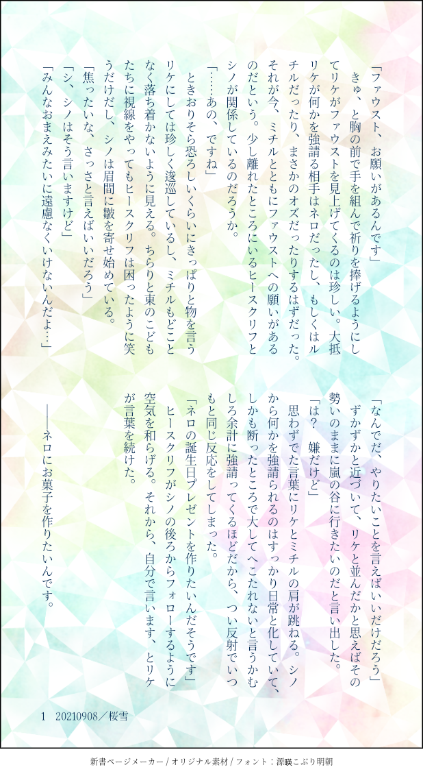 azurem00n☆quiet followDONE【mhyk】ネロお誕生日おめでとうございます!東+リケとミチル ##CPなし show all(+5 images) Tap to full screen (size:618x1132).Repost is prohibited Let's send reactions! freqpopularsnackothersPayment processing Replies from the creator Follow creator you care about!☆quiet follow azurem00nPAST鉄血まとめ/CPはオルユー 14 azurem00nPAST昔書いた諏訪荒出てきたのでまとめました。(最後のやつだけ当奈良含みます。)だいぶ前に書いたので解釈違うのもありますがせっかくなので…… 9 azurem00nDONEインモラルワールドの例のところで晃牙くんの体調不良に気づく零さんのお話。(短い)零晃いいな、と思い始めたあとにMV初めて見まして、動揺のあまりノーツ叩くのミスりそうでした……… 1197 azurem00nDONE「プリズンブレイカーズ」後のお話。何番煎じかもしれないですが、やきもち零さん 6345 azurem00nDONE『OO』後のお話。晃牙くんがずっとしょんぼりめ。 3852 azurem00nDONE2部の先生会議のあと、こんな時間があったらないいなぁのレノフィガ。フィガロめちゃめちゃ仕事してるじゃん……となったのと、あなたは抱えてるひみつをどちらも話さないのか~~にたまらなくなってしまったので。 2 recommended works lecona2389dropDONEそういうブラネロ3ありがとうございました!支部にも後ほど色々修正して載せようと思います~。 5091 uma_mhykDONEパラロイ/ブラネロ漫画① 12 908banmenokobunDONE2022年2月27日開催のブラネロ冬春webオンリー『氷を溶かす春の花』参加作です。二人の出会い編前半です。ブラッドリーが年下であるほか、捏造だらけで、流血もあります。何でも許せる人向けです。後半は春が過ぎ去る前に公開するのを目標にしています。 eibonbonsDOODLE御沢 🙇♂️ 908banmenokobunDONE6/25/2022 ブラネロワンドロ様の6/18のお題「宝石」をお借りして描いたポエムマンガに加筆したものです。第2部までのネタバレがあります。 OotukinousaDONE多分うっすら付き合ってるふたり。 9 salmon_0724DONE2022.8.28 そういうブラネロ7 展示作品です。 7743 もろみDOODLE天才フォロワーのゼトゼロ死ネタSS2本目でむちゃくちゃになっちゃったので… salmon_0724DONE2023.1.14-15 そういうブラネロ8 展示作品です。※二つ前に投稿している作品の続きですが、読まなくてもたぶんそんなに問題ありません。※賢者(女性)が出てきます。 8192
