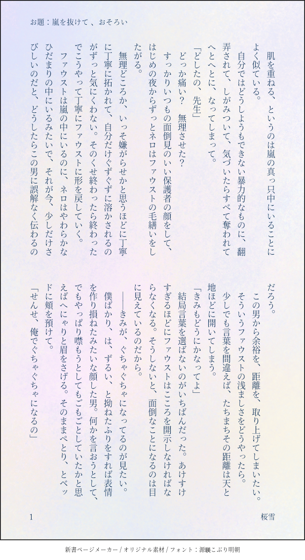 azurem00n☆quiet followDONE【ネロファウ】事後、まったりしてるネロファウ。今週のネロファウさんから、お題:嵐を抜けて、おそろい をお借りしました。 show all(+1 images) Tap to full screen (size:618x1132).Repost is prohibited Let's send reactions! freqpopularsnackothersPayment processing Replies from the creator Follow creator you care about!☆quiet follow azurem00nPAST鉄血まとめ/CPはオルユー 14 azurem00nPAST昔書いた諏訪荒出てきたのでまとめました。(最後のやつだけ当奈良含みます。)だいぶ前に書いたので解釈違うのもありますがせっかくなので…… 9 azurem00nDONEインモラルワールドの例のところで晃牙くんの体調不良に気づく零さんのお話。(短い)零晃いいな、と思い始めたあとにMV初めて見まして、動揺のあまりノーツ叩くのミスりそうでした……… 1197 azurem00nDONE「プリズンブレイカーズ」後のお話。何番煎じかもしれないですが、やきもち零さん 6345 azurem00nDONE『OO』後のお話。晃牙くんがずっとしょんぼりめ。 3852 azurem00nDONE2部の先生会議のあと、こんな時間があったらないいなぁのレノフィガ。フィガロめちゃめちゃ仕事してるじゃん……となったのと、あなたは抱えてるひみつをどちらも話さないのか~~にたまらなくなってしまったので。 2 recommended works chomoimoiPROGRESS情緒が乱れた結果見た幻覚原稿が完成しました!!合同誌なので6pで完了です!後は任せた…ぜ…(溶鉱炉に親指立てながら沈んでいく)追記)3月のエアオンリー「そういう事にしているつもり!2」にて合同誌頒布予定です追記2)あくまで予定ってやつです!追記)「おたまほ2」に変更です!今暫くお待ち下さい!追記)予定は未定ってえらい人も言ったもんだ。 cross_blueskyPROGRESSパラロイ本(ブラネロ)の冒頭部分。 5751 azurem00nDONE【ブラネロ】ワンドロライなどでTwitterに上げたSSまとめです。 16 syamunanDONE12月19日ブラネロWEBオンリー「そういうことにしてるつもり!」開催おめでとうございます🎉漫画は間に合わなかったのでイラスト展示で失礼します!※盗賊時代の服装捏造してます 畑耕しマンDOODLE🌙🐰兄弟パロ兄🐰(大学)←弟🌙(高校)フォロワー様の設定をお借りした三次創作です 4 OotukinousaDONE多分付き合ってるネファネ 引き留めるネロを寝かしつけるファウスト 1476 bantyanizumuDOODLEはるはや/チアの格好でえっちさせたかった癖と欲…がっつりじゃないけど念のため18↑(yes/no) 2 91011fuDOODLE よづりDONE「俺にはあんたがいれば、」相棒と呼んでくれた彼が頭に浮かぶ。真っ先に浮かぶのは、好物を前に子どもみたいな無邪気な表情をしているボス。続け様に、血だらけで近付いて口元に耳を寄せなければ生きているのかも分からない横たわったボス。叫びたくなる衝動に眉を顰める。自分の命はいつだって彼の為に捧げられる。たとえ「裏切った」とまともに顔を見れない今でさえも。ふと自分の命の行先を考える。最期まで彼中心。 2